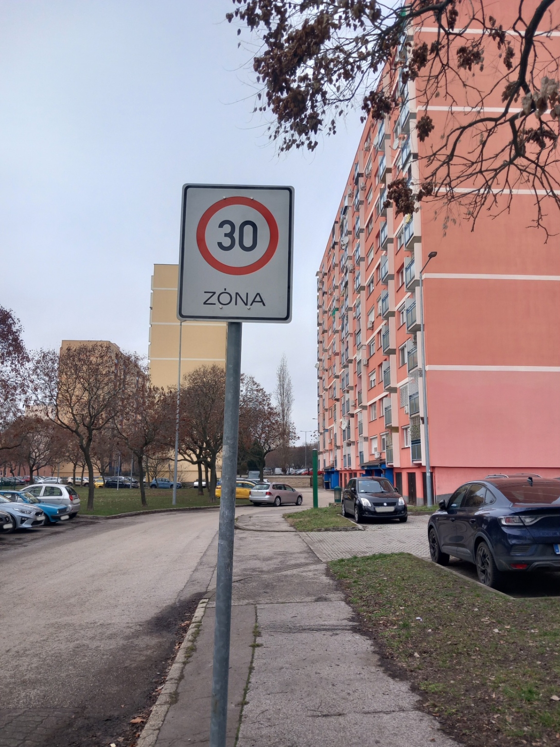 A Szőlővirág utca 14 es szám alatt parkoló bejáratánál a közúti 30 as övezet tábla kifakulás látható
