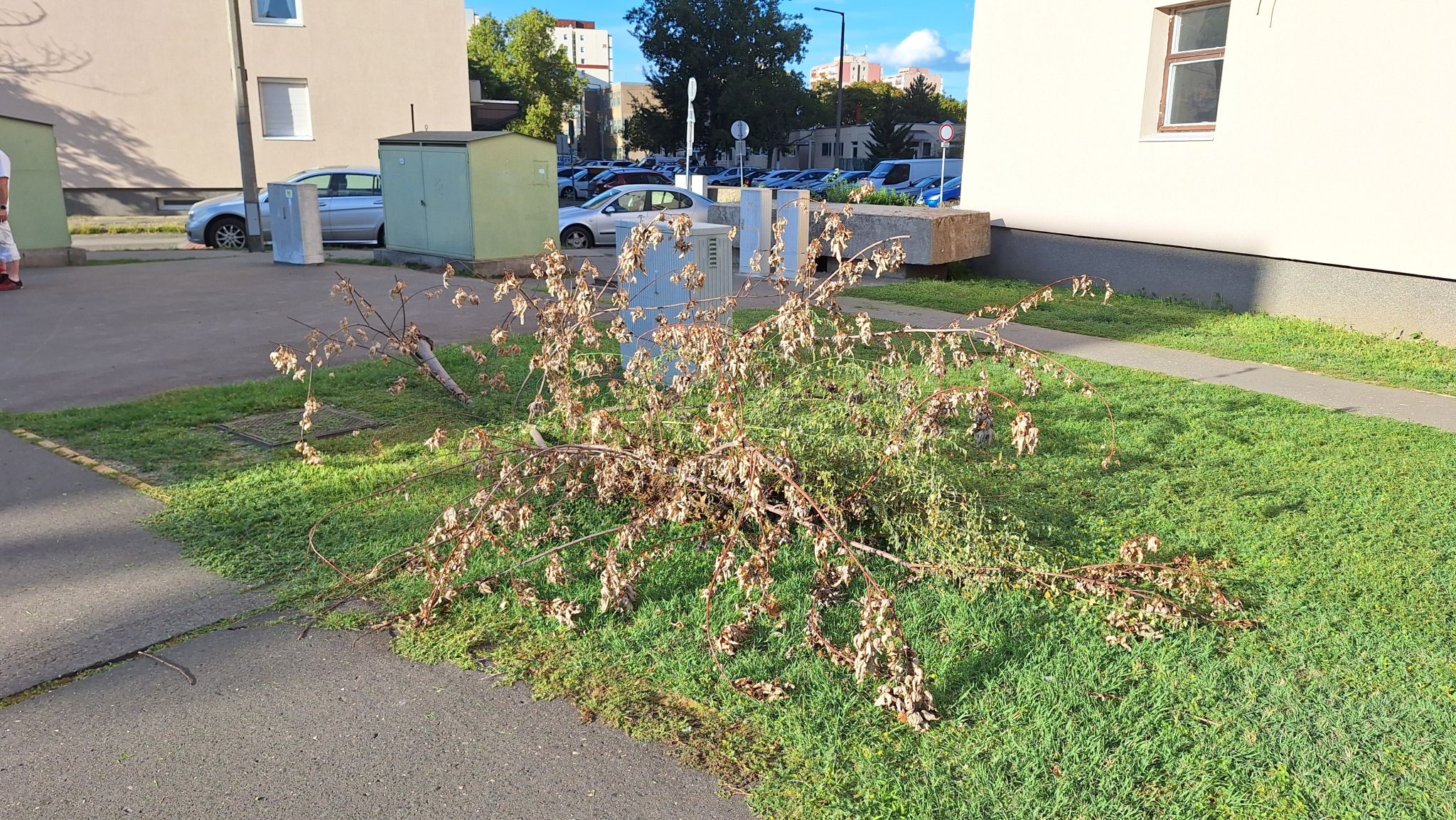 A Baross utca - Topánka utca sarkánál fekszik a földön egy leszakadt faág.