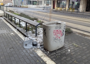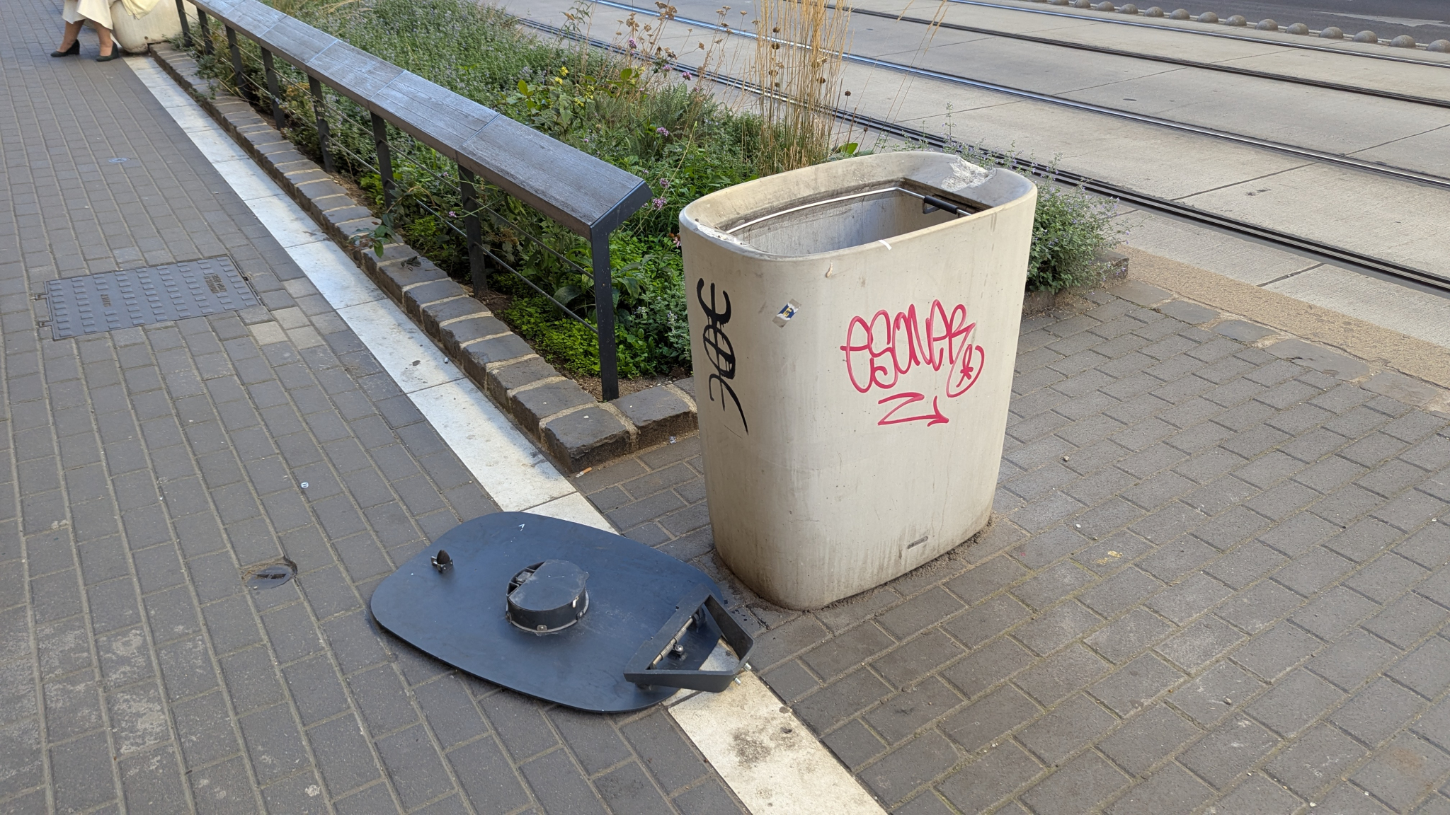 A II. Kerület Margit körút 22-24 előtt található köztéri szemetes tetejét letépték és a kuka mellé rakták.