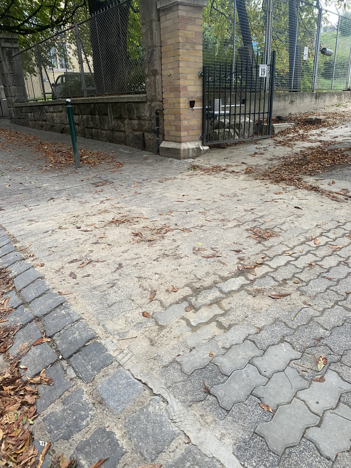 A 1123 Budapest, Kék Golyó utca 19. szám előtt hetek óta jelentős mennyiségű hordalék (kavics, sár és homok) halmozódott fel, amelyet a nagyobb esőzések mostak le az útról. Minden kisebb esőzés újabb sárréteget eredményez, amely a járda teljes szélességét elfedi, így a gyalogosok számára szinte lehetetlenné válik a kikerülése.