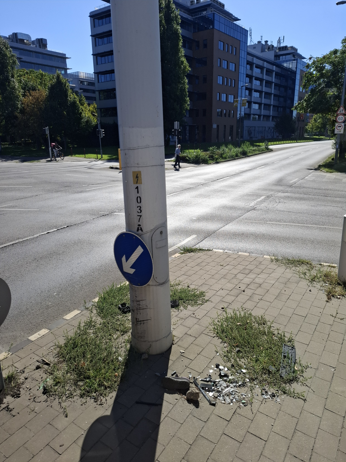 A járdaszigeten törött autó maradványok, cipő, dísztárcsa és egyéb szemét van. Mellesleg nagy a gaz is. Kérem takarítsák össze!
