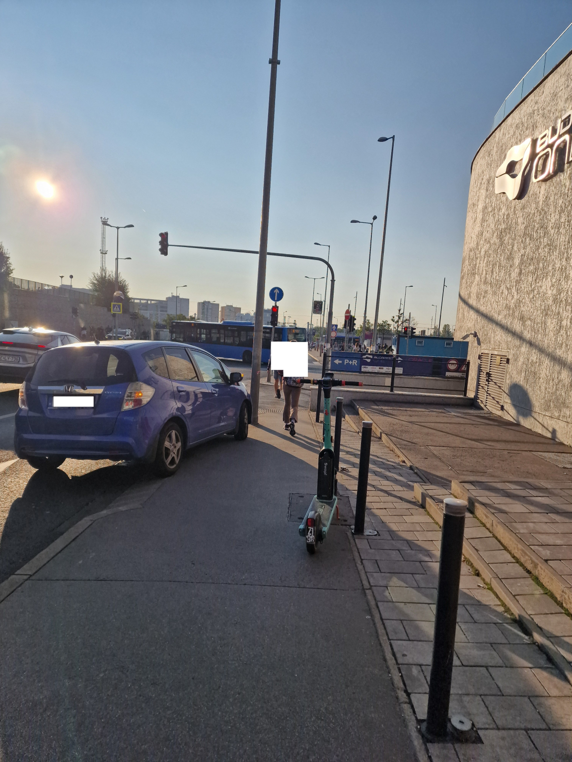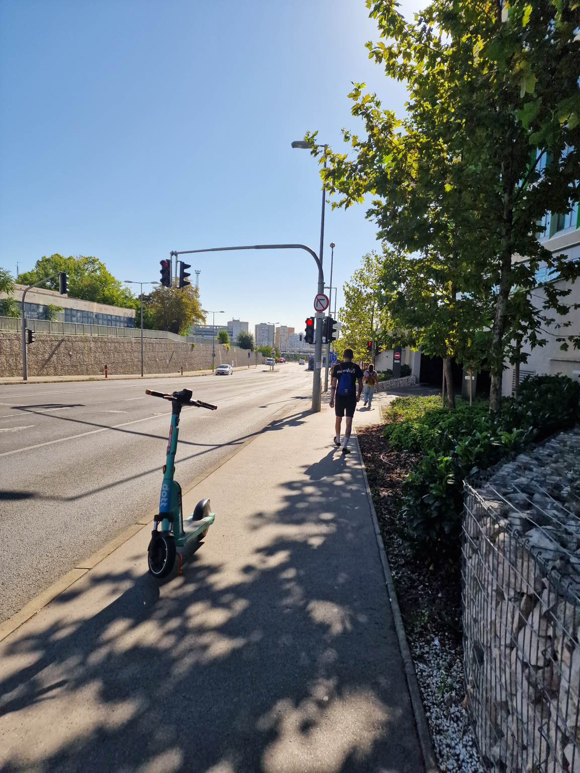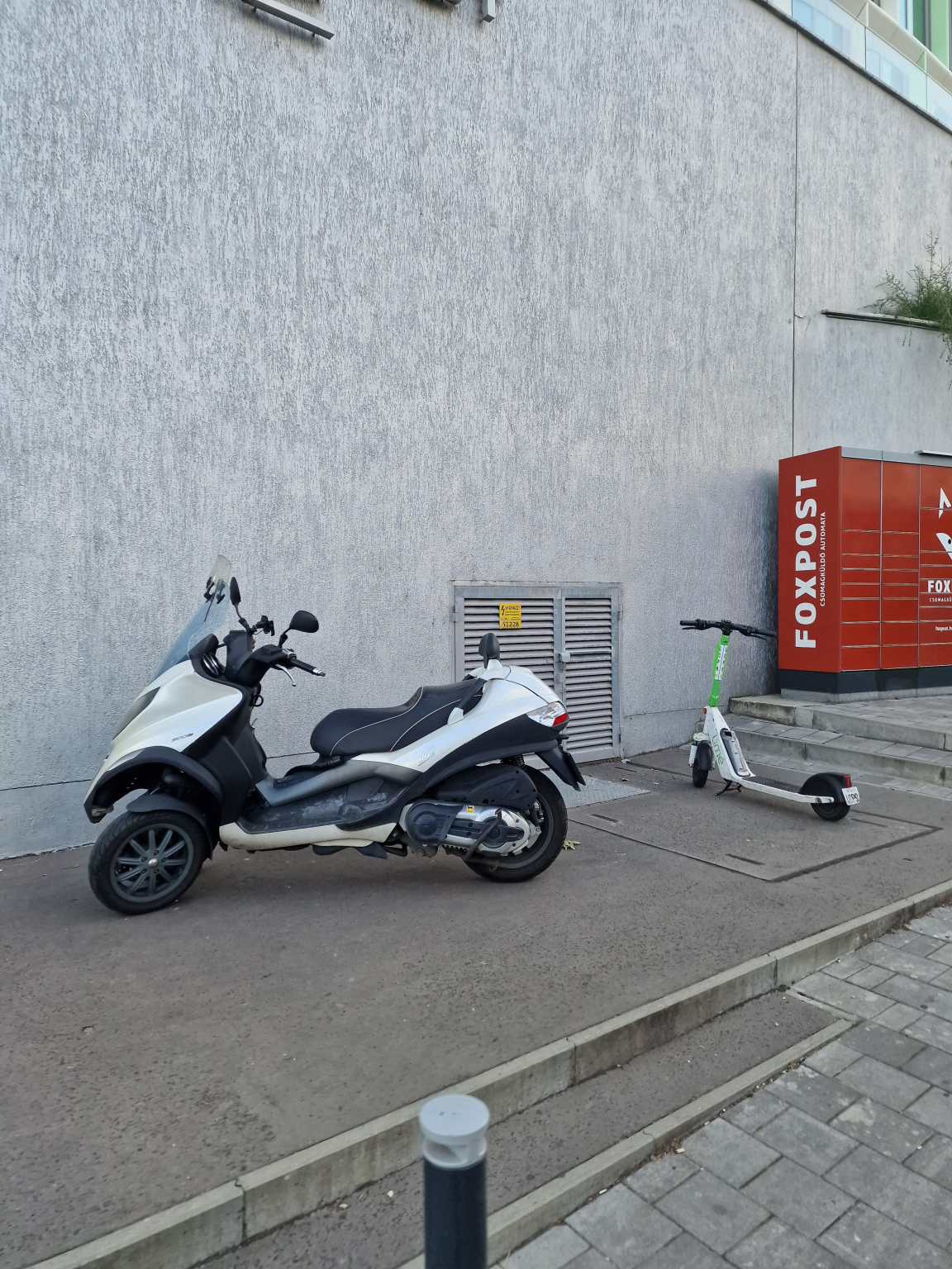 A Koszorúslány utcai keskeny járdán hagyják rendszeresen a közösségi rollereket, pedig 100-200 méterre innen van egy dedikált mikromobilitási pont Kelenföld aluljáró bejáratánál. Van olyan roller, amit ráadásul a Budapest One irodaház tűzoltósági felvonulási területén hagynak, amit KRESZ tábla is jelez.