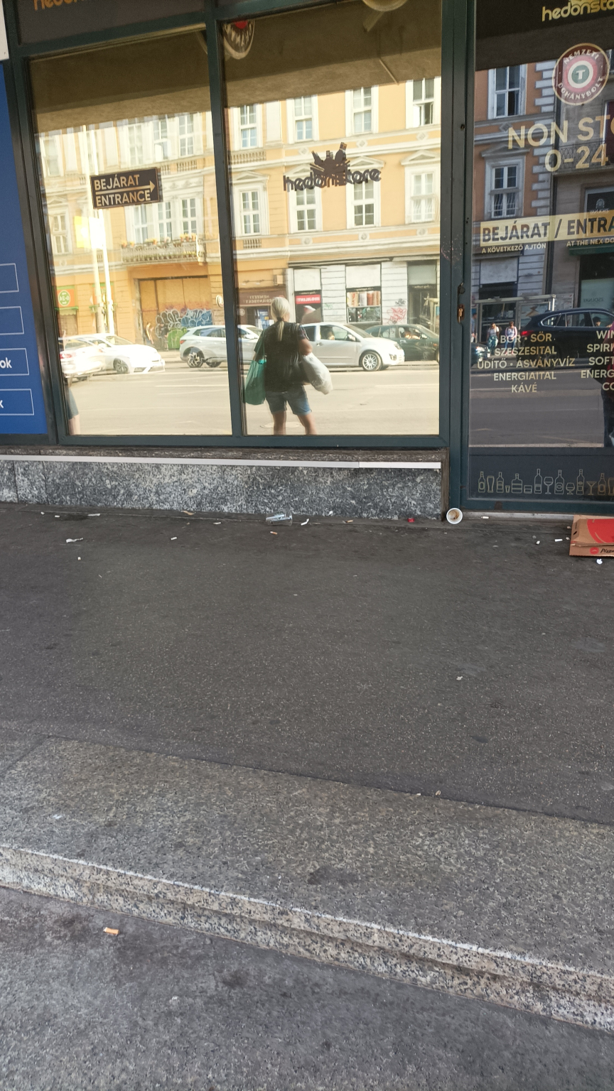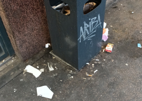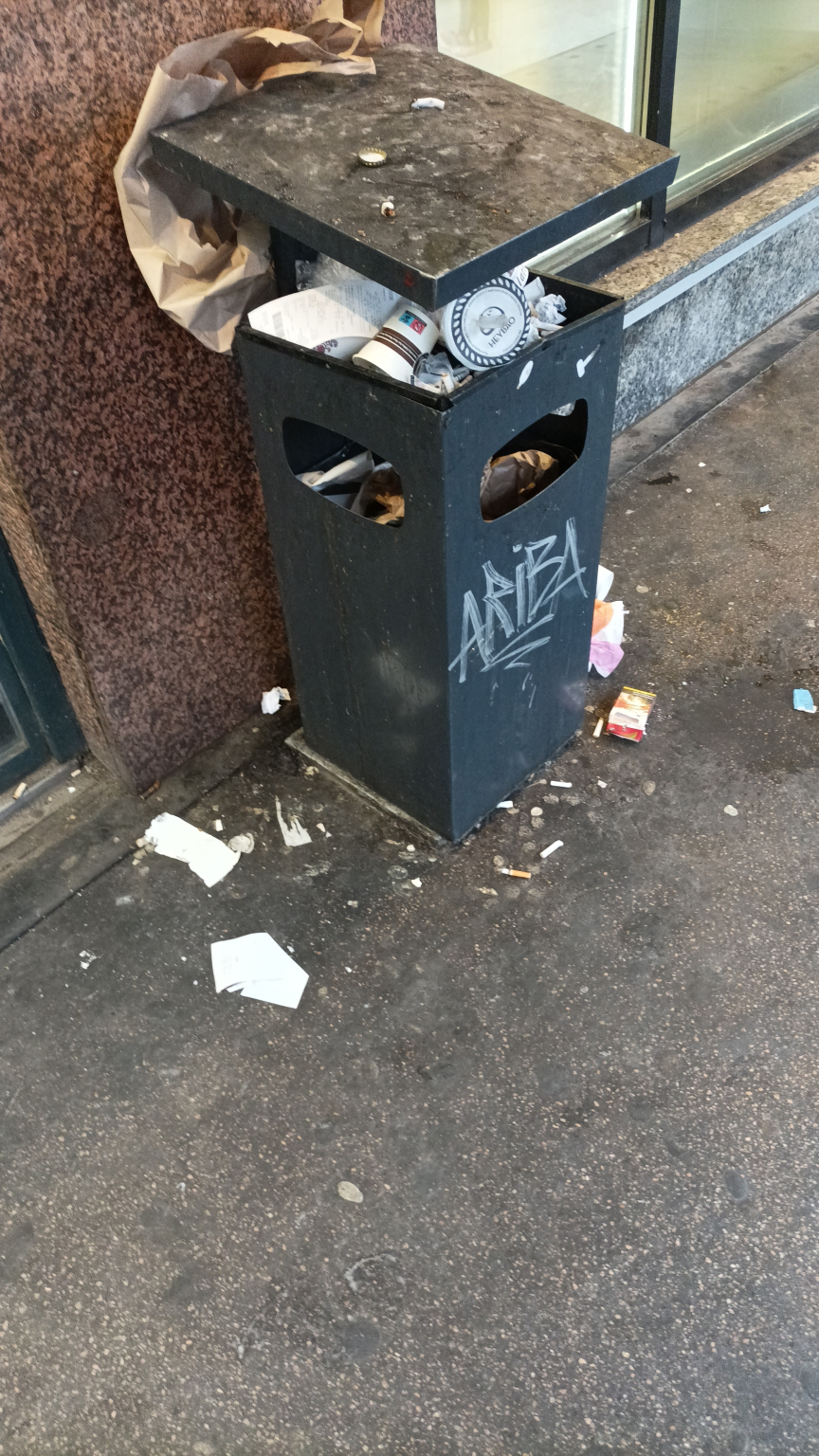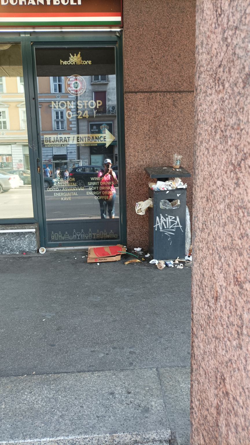 „Ma este jártam arra. Nem tudom, mikor takarítottak és konkrétan mit, de a kuka tele volt, sőt mellette is kihullva a szemét, a járda sem úgy nézett ki, mint amit letisztítottak. A járdát nem tudtam lefényképezni, mert sokan álltak ott. De erre a kukára ráférne egy alapos mosás, vagy teljesen ki kéne cserélni. Esetleg több edényt kihelyezni, mert láthatóan nem elég.”