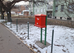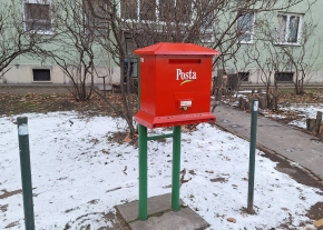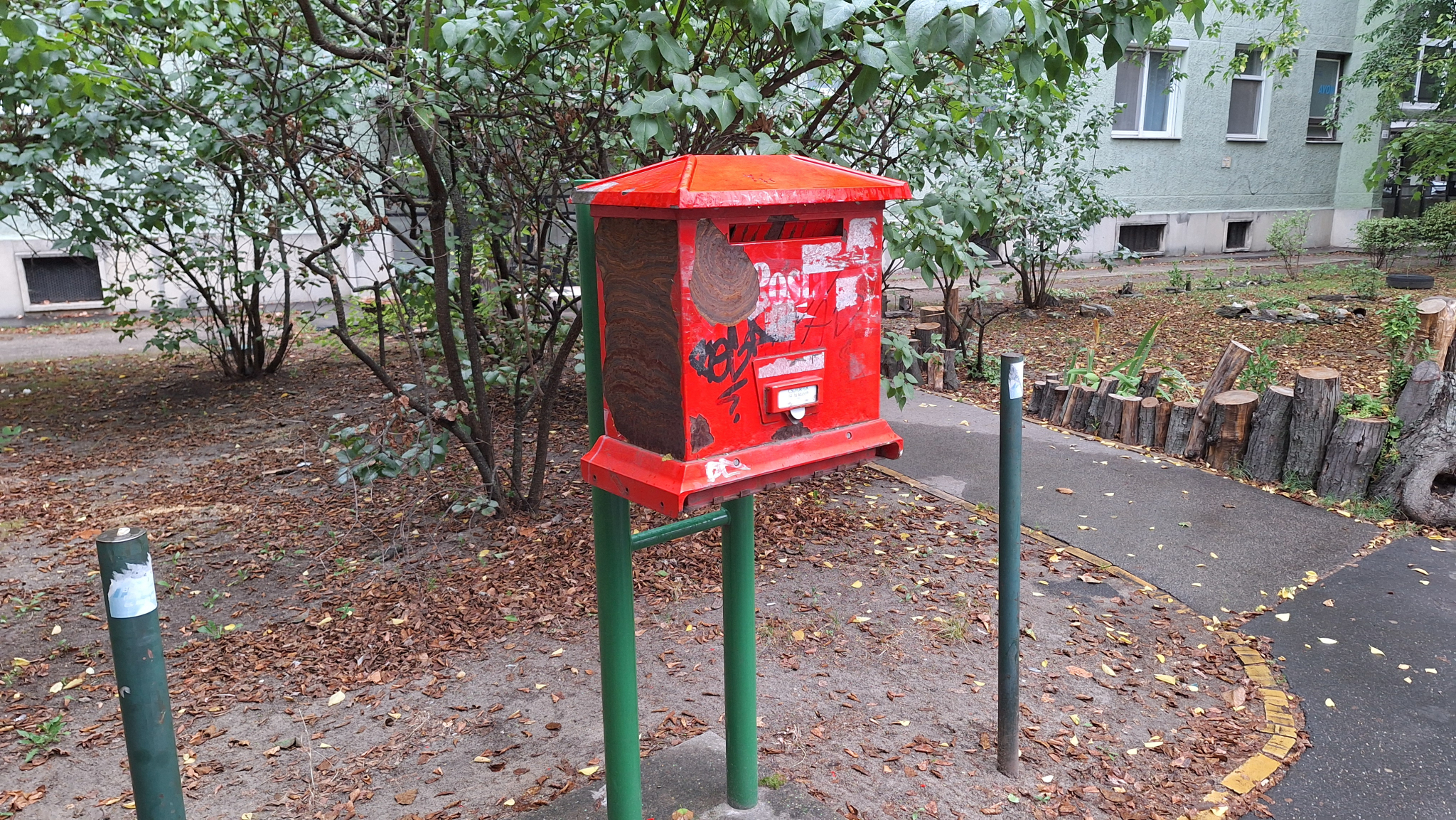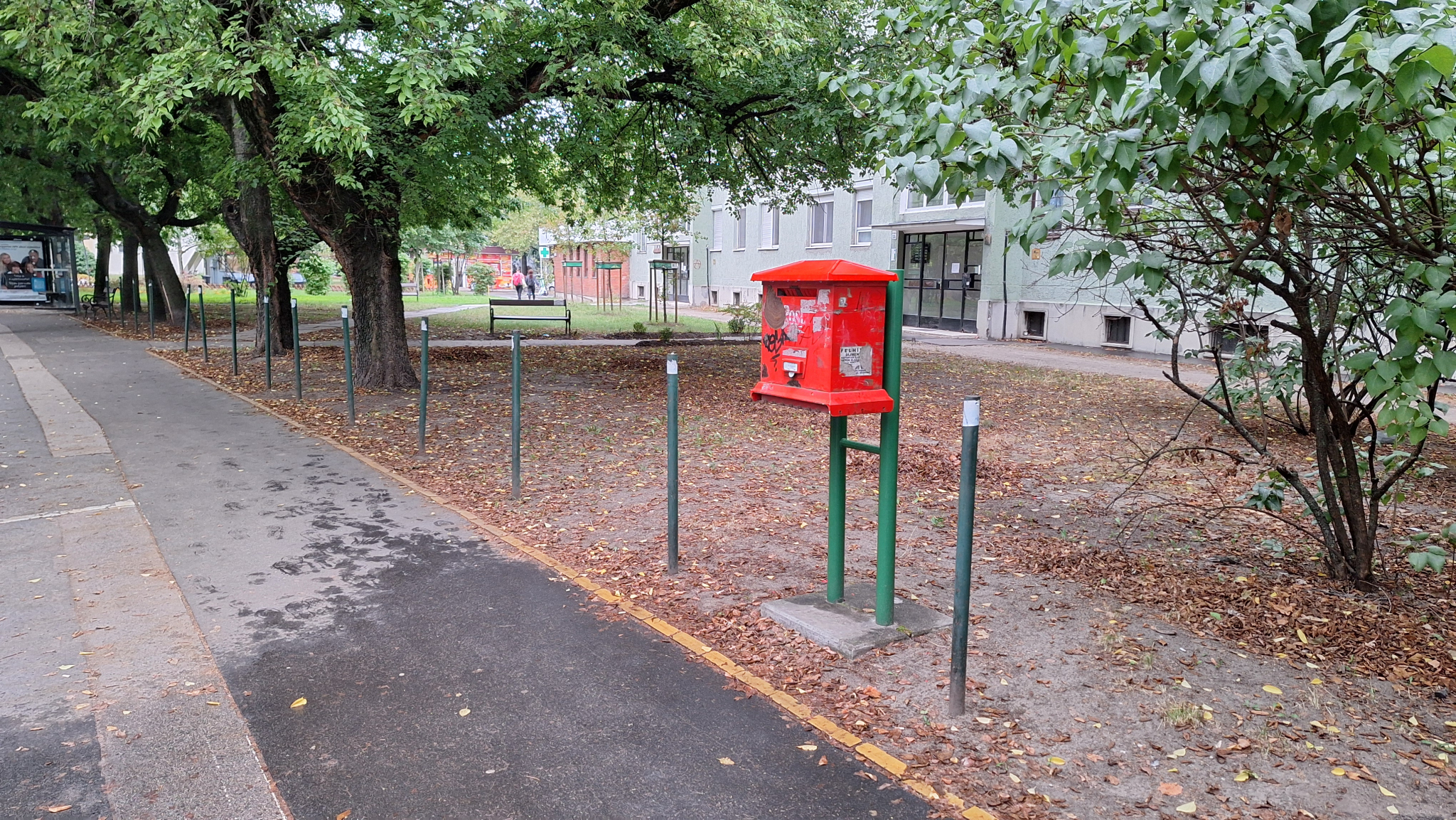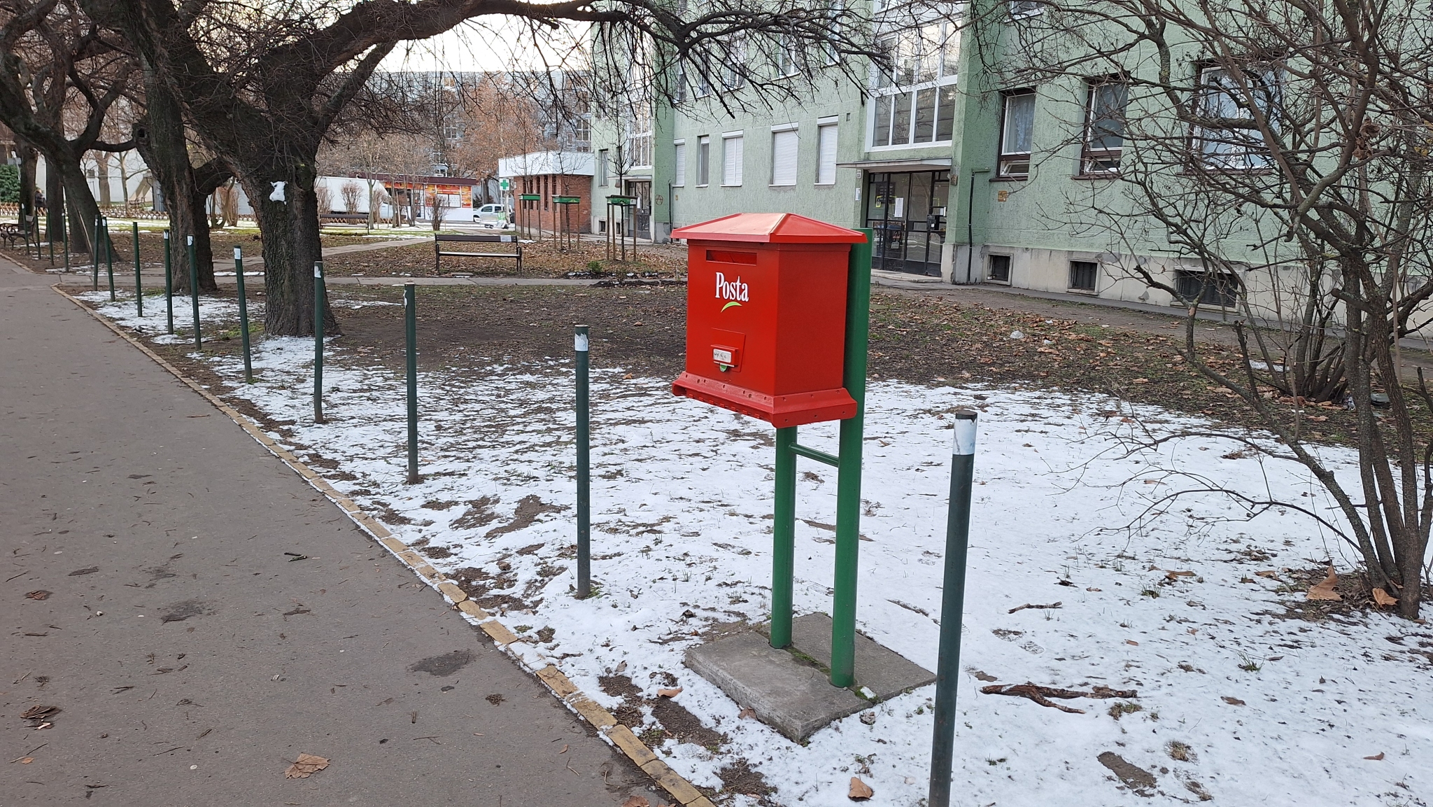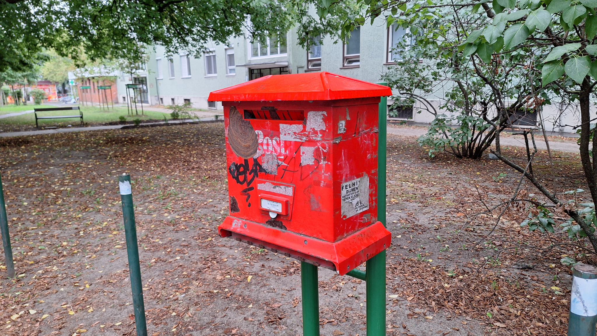 A Dési Huber utca 13. előtti levélgyűjtő szekrény nagyon megviselt állapotban van. Lepattogott róla a festék, rozsdásodik, össze van firkálva, matricázva.