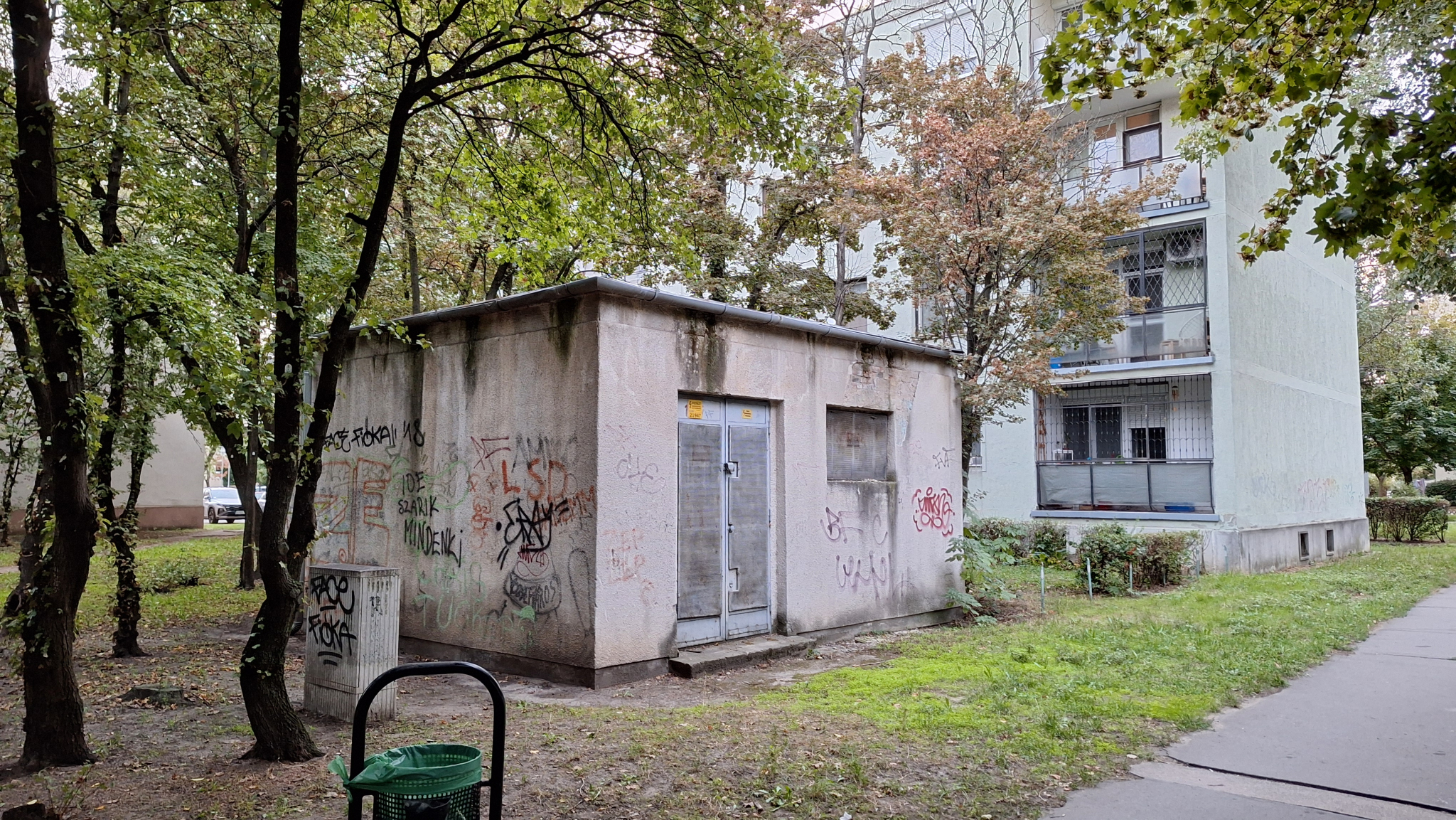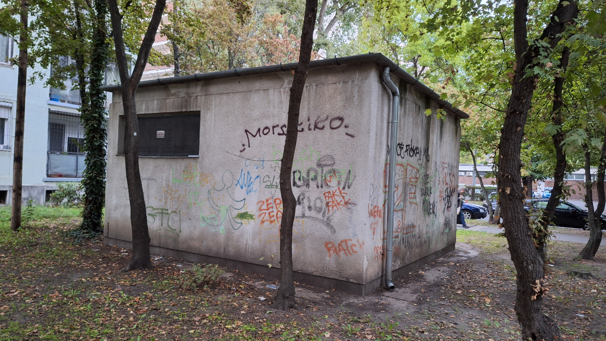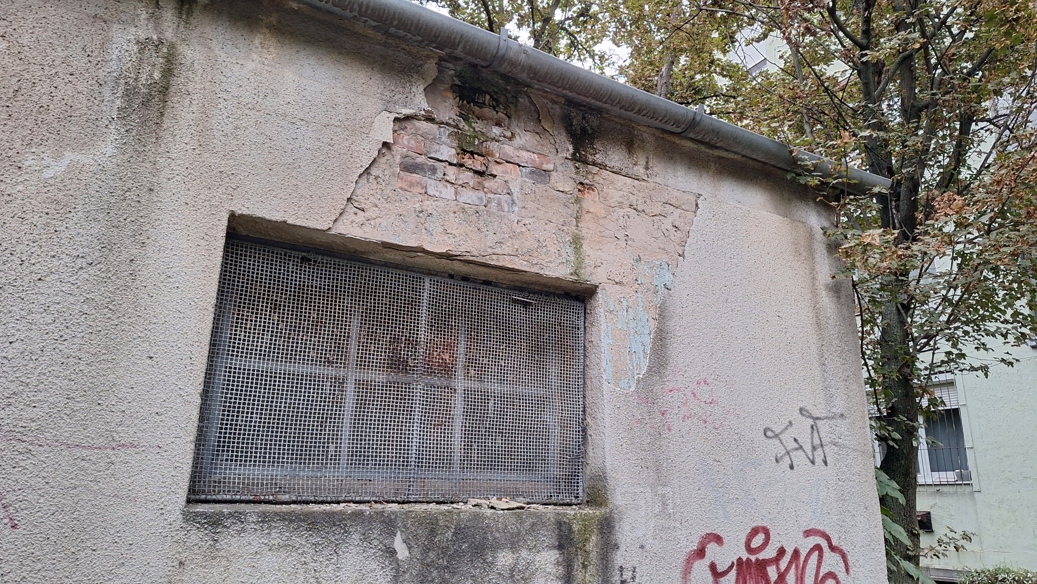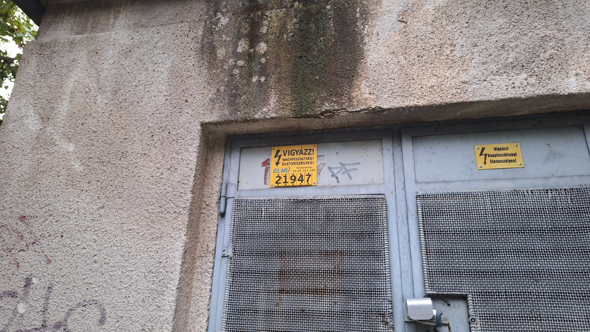 A Dési Huber utca 4. mögötti trafóházról málik a vakolat, láthatóan vizesedik felülről a rossz eresz miatt, a falai össze is vannak firkálva.