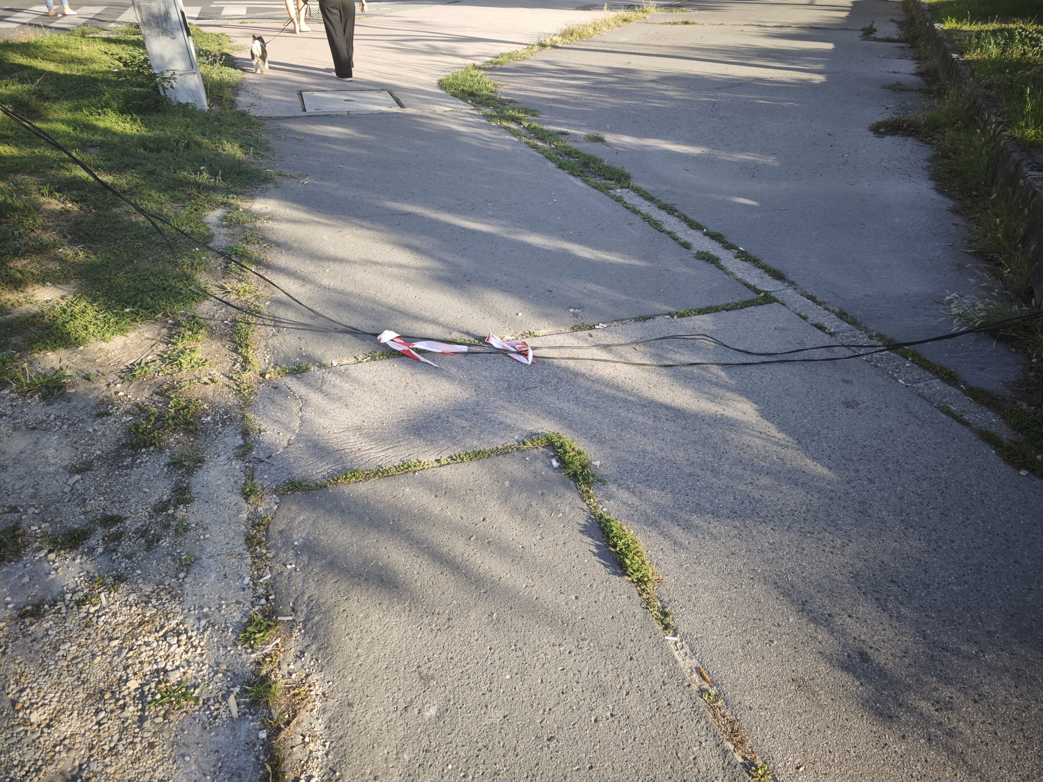 Tisztelt Járókelők! Járdán keresztbe fut egy leszakadt vezeték, botlás veszély.