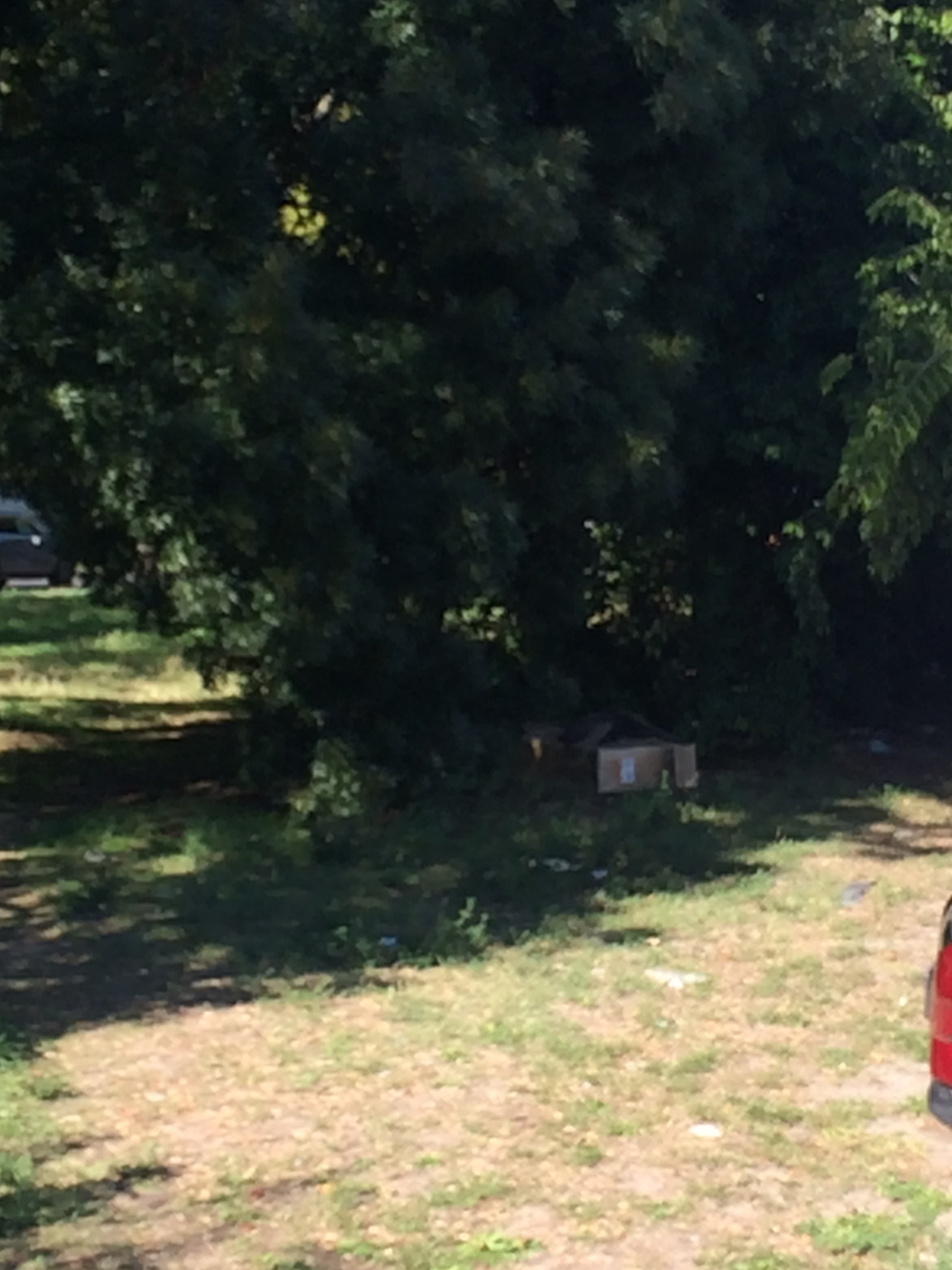 Jelzett zöldterületen sok szemét van a bokrok között, illetve rengeteg ágtöredék is halmozódik a területen.