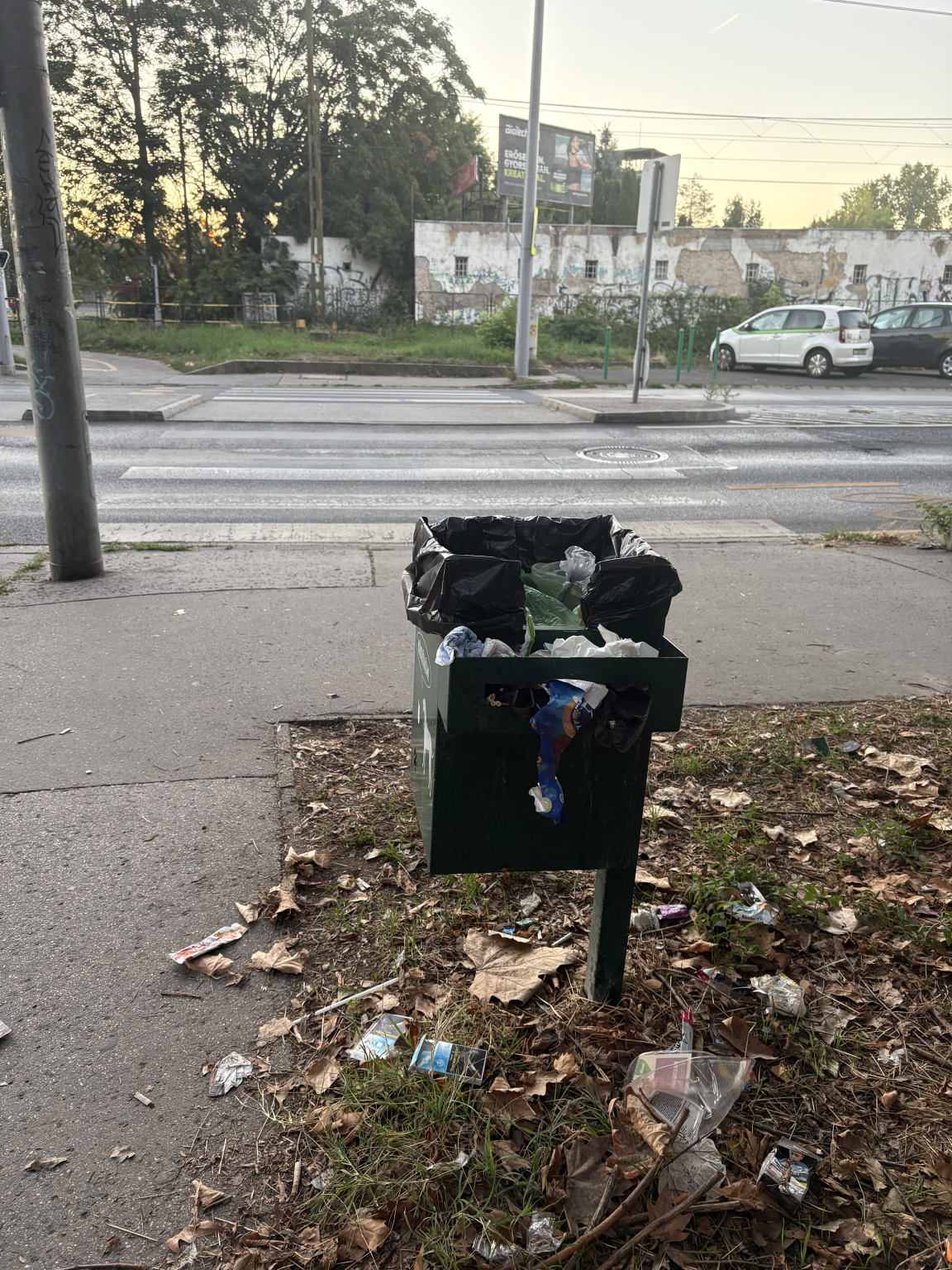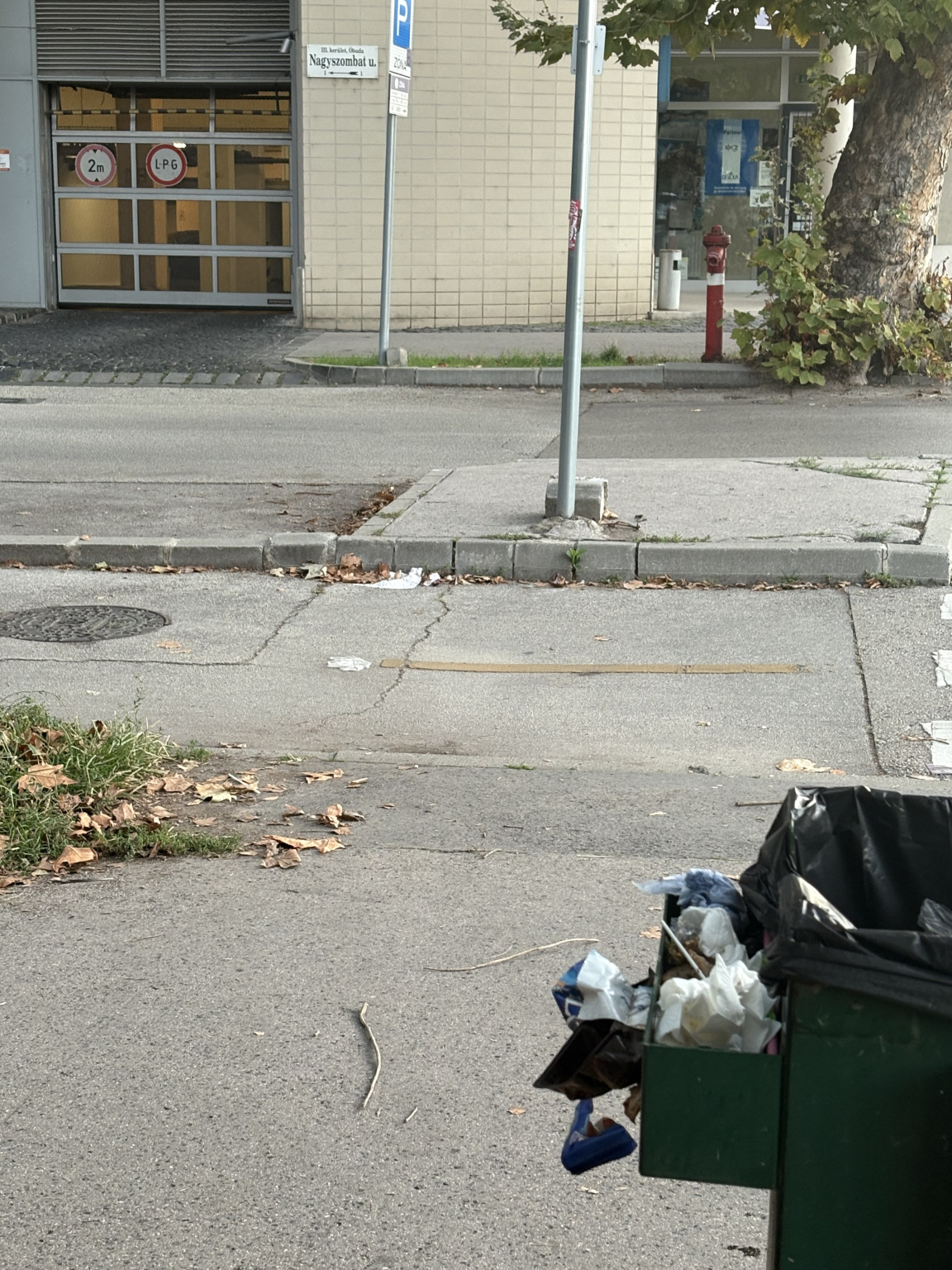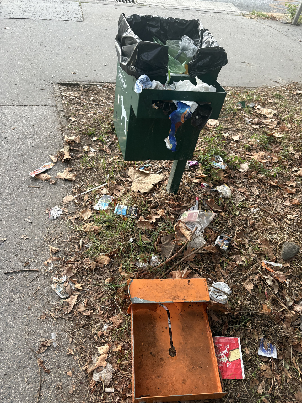 Kutyaürülék gyűjtő teteje leszedve, mindenféle szemét bedobálva.
