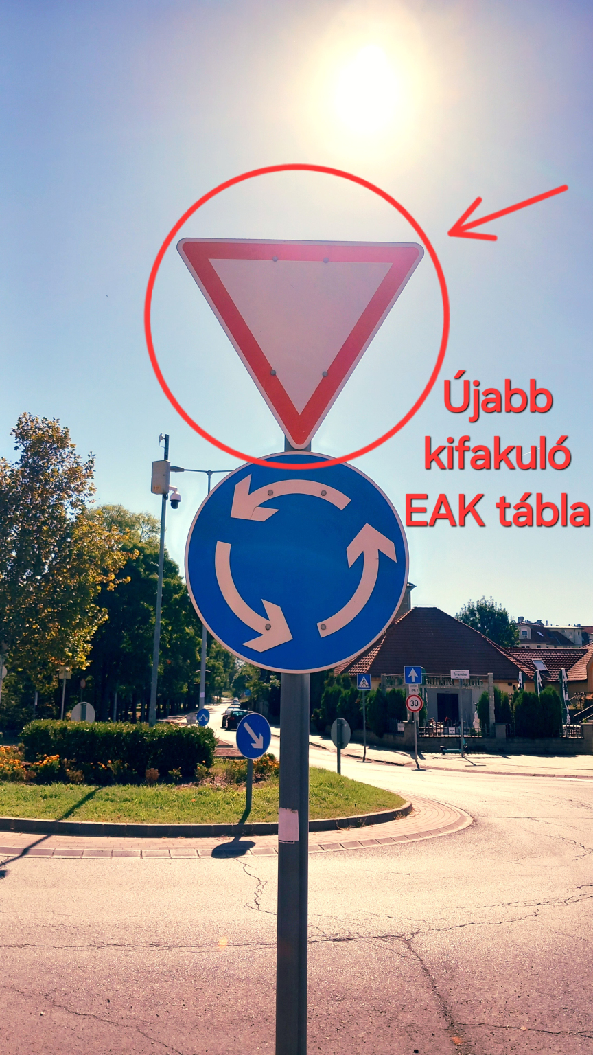 A Bányató utca és Tavas utca között találkozásán körforgalomnál közvetlenül 85 ös és 85E busz vonalán a közúti EAK tábla újabb kifakulás látható