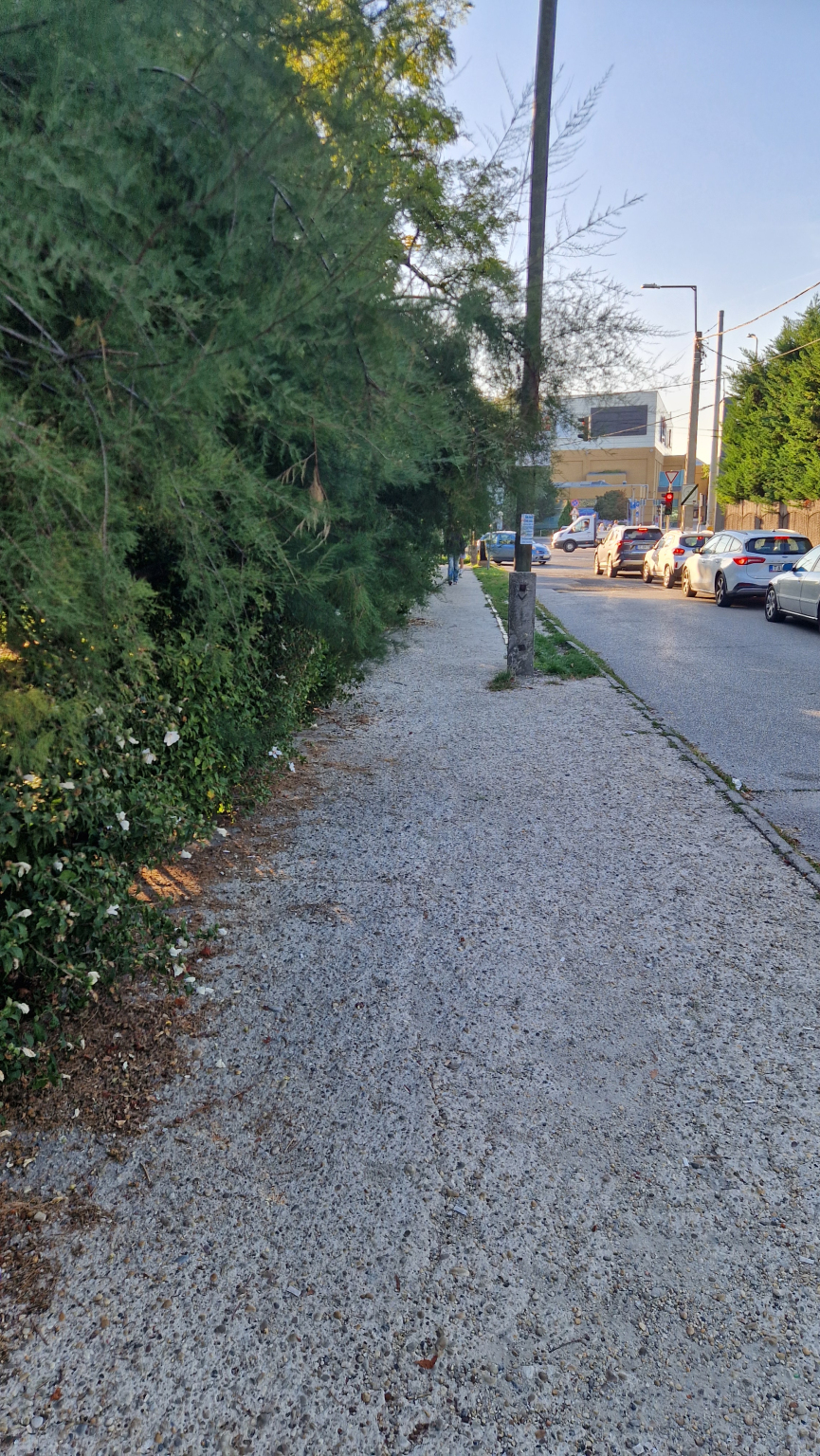 A járdára belógó növényzet miatt csak részben használható a járda.