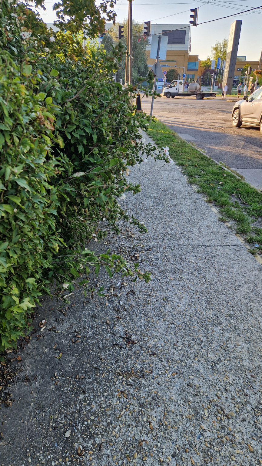 Helyszíni szemle során megállapítottuk, hogy a jelzett, járda fölé nőtt sövénysor visszavágása felszólításunk nyomán megtörtént. Reméljük ezt Ön is megnyugtató módon tapasztalta.