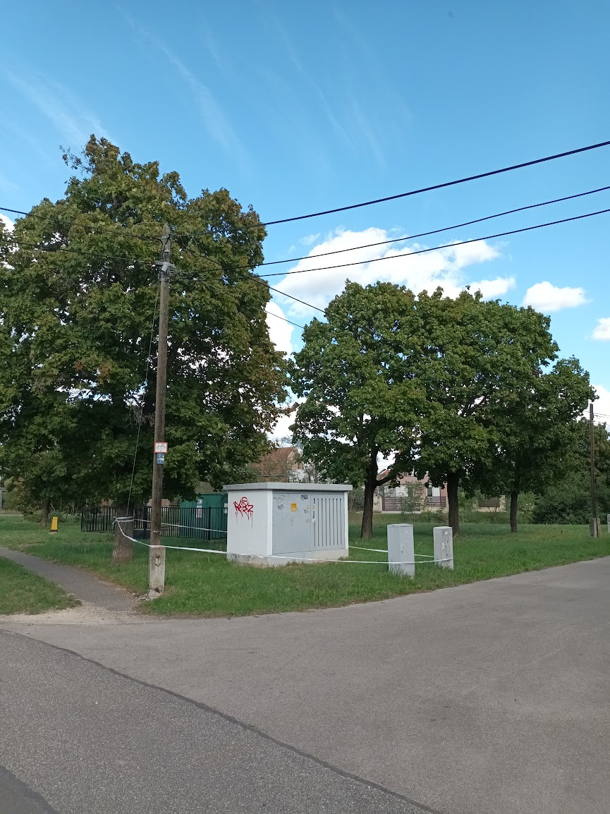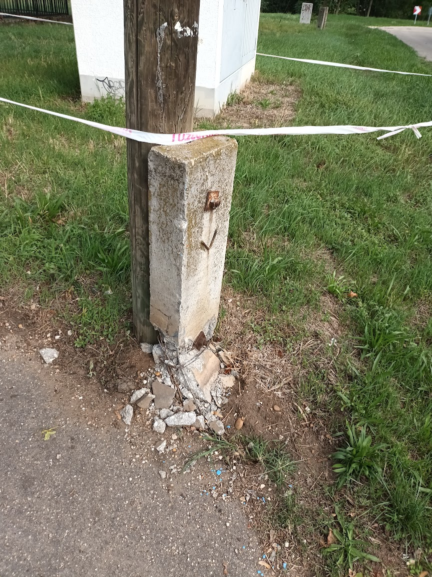 kb egy hónapja a sarkon lévő építkezésre érkező munkagép ment neki az oszlopnak, állítólag a tűzoltók is kint voltak, mert a szalagot ők húzták ki, nem tudom, hogy ők hivatalból tettek e bejelentést az oszlop miatt, de nem történik semmi, ha én jól láttam nem áram oszlop, hanem tv, internet, telefon..