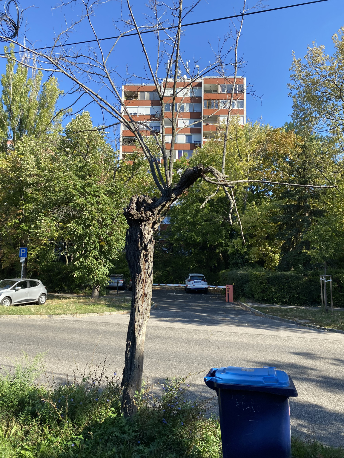 A Törökvészi út 84. és 86. szám előtt két fa teljesen kiszáradt. Kérem szíves intézkedésüket.