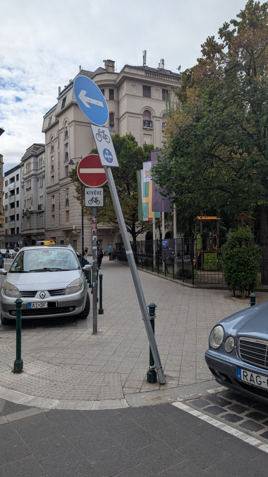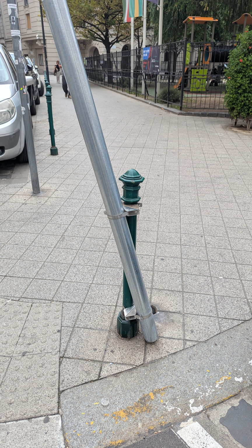 Megdőlt a fotón látható oszlop és tábla kombó, mert nem megfelelően lett rögzítve. Az oszloptartó konzol és annak éles sarka amúgy egy gyerek fejének magasságában van, ezért kérem, keressenek más megoldást az oszlop rögzítésére.