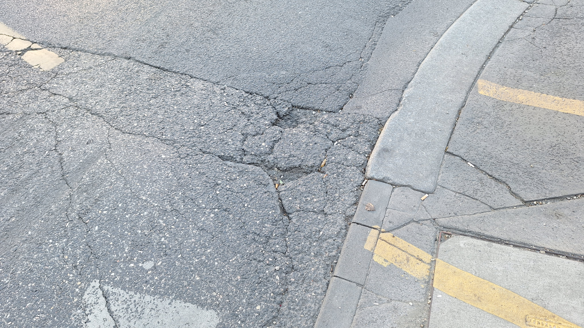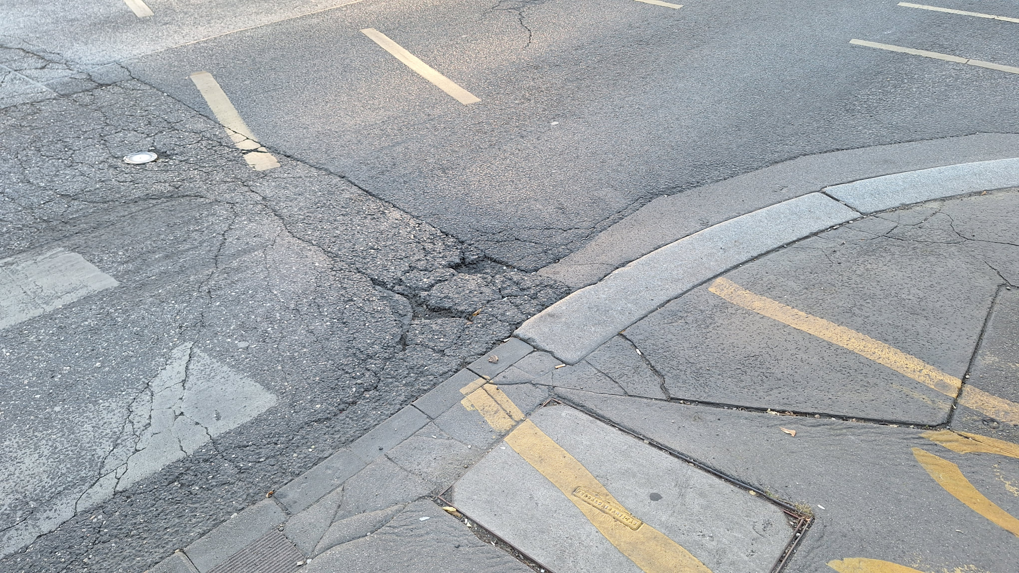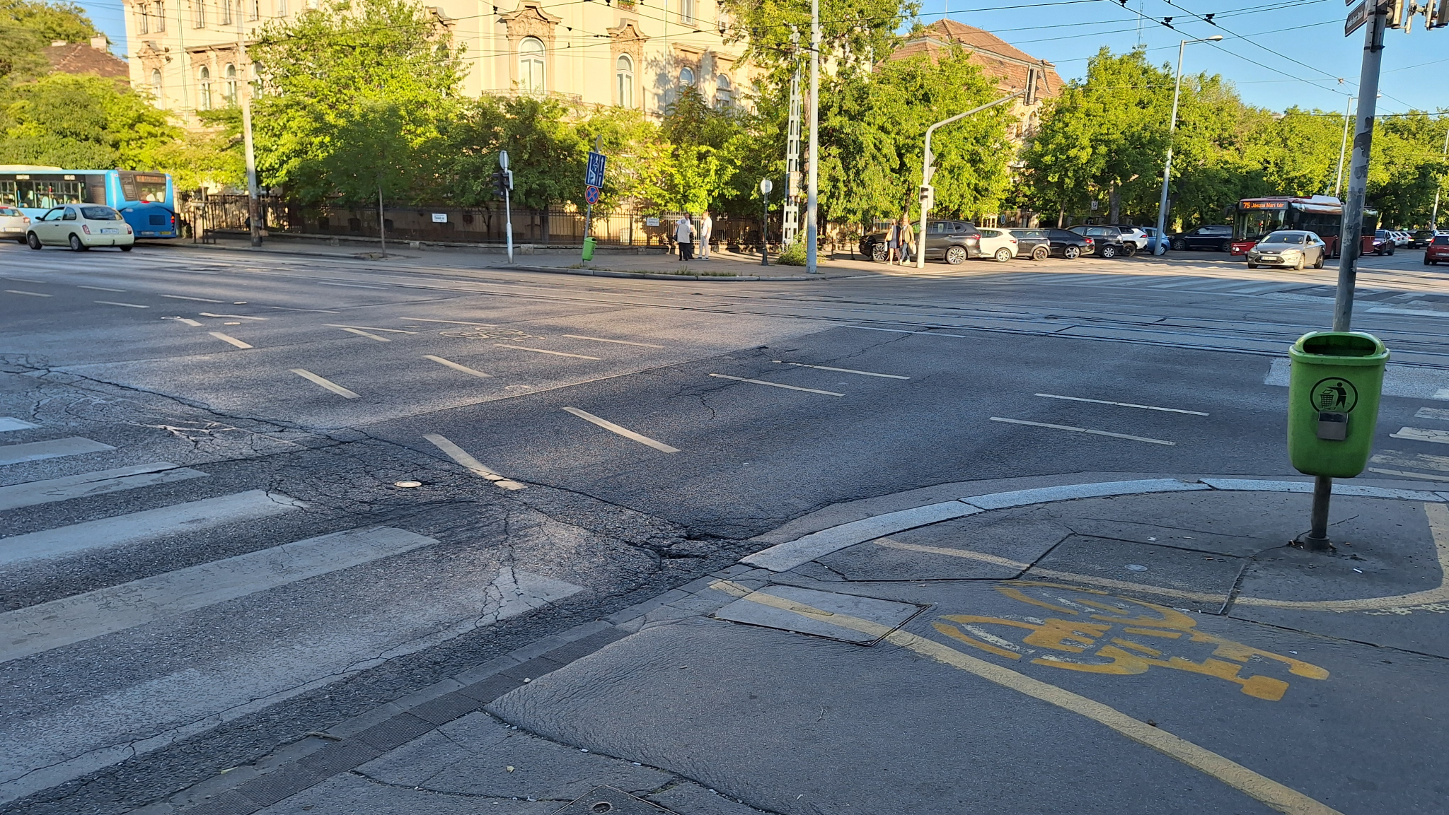 A Thököly és a Stefánia út sarkán pont a bicikliút sávjában egy ponton erősen kátyús az úttest.