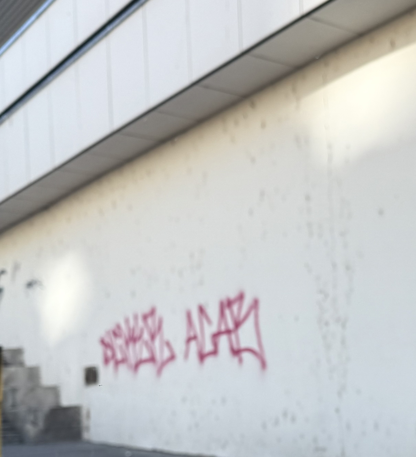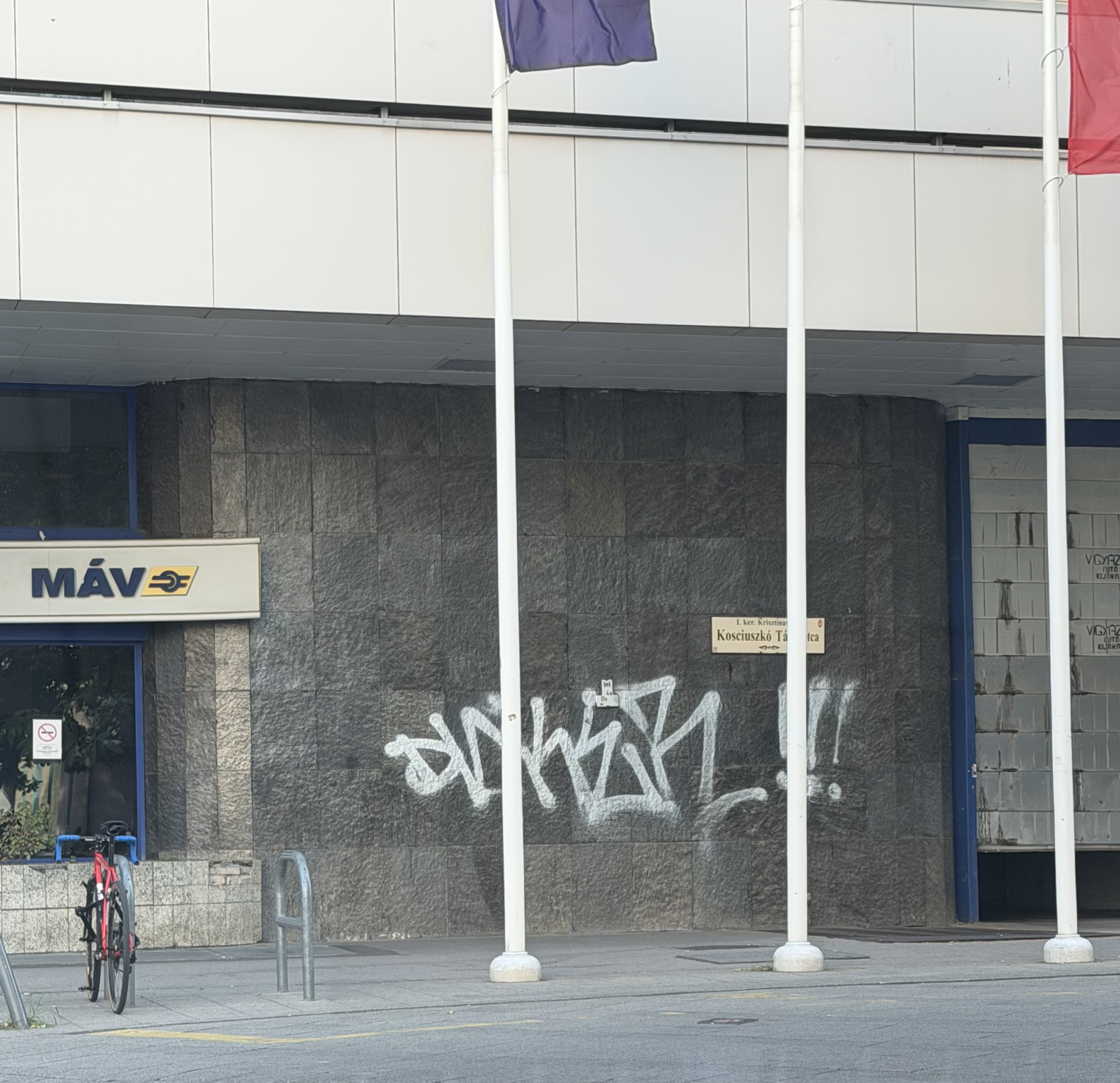 Graffiti a Déli pu. homlokzatán és a lépcsőn a Kosciuszko Tádé utca oldalról