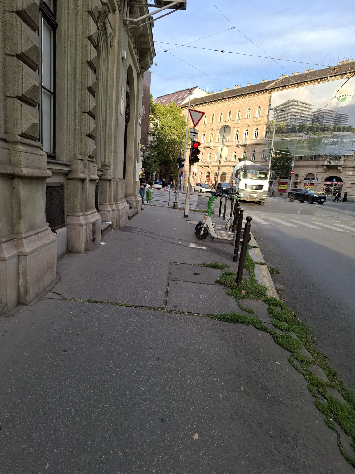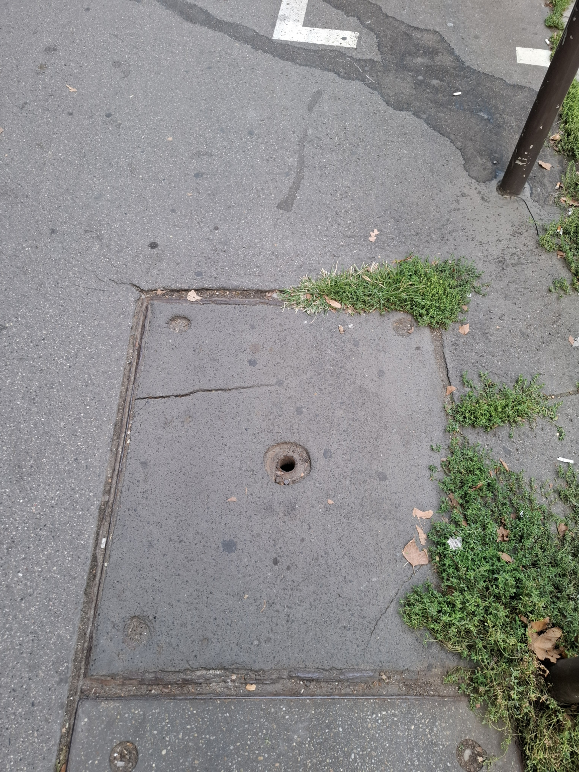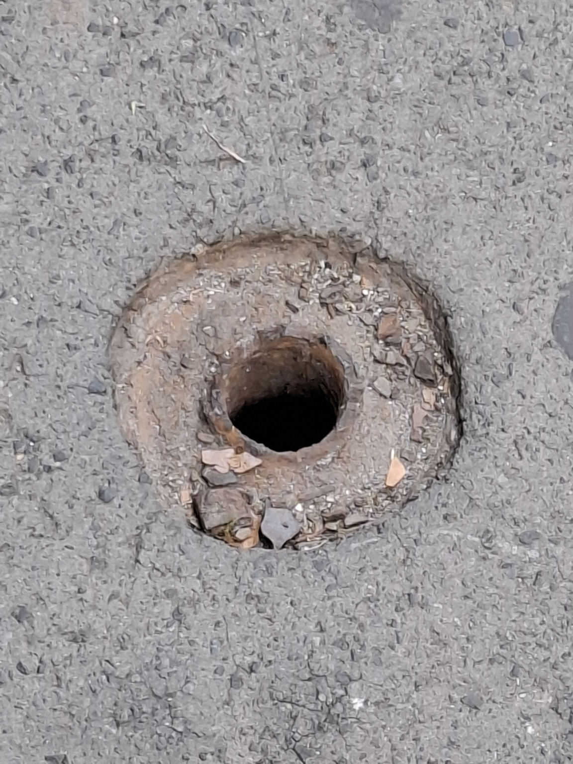 A Kálmán Imre utca 26 előtt a fedlap tetejéről letört a jelzés, így egy hegyes rozsdás fém mered a járókelők talpa felé.