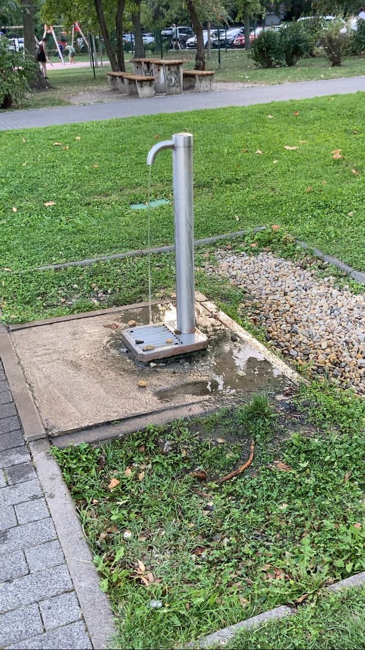 A megjelölt helyszínen álló ivókút -ki tudja mióta- folyamatosan, azaz 0-24 órában folyatja a vizet. (3 napja már biztosan folyik.) Nem lehet elzárni.