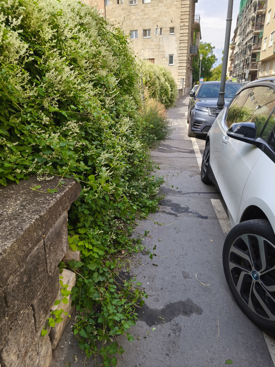 Kérem az üres telekről az amúgy is keskeny járdára belógó növényzet visszavágását!