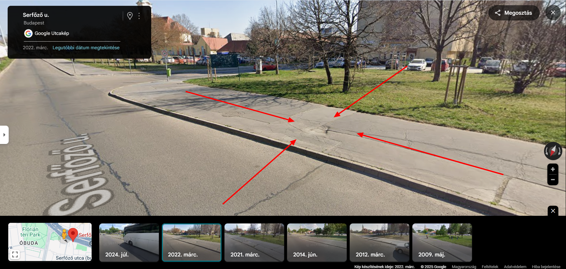 Beszakadt járda már a 2021 évi Google képen is rajta van , több hónapja ki van bójázva.
