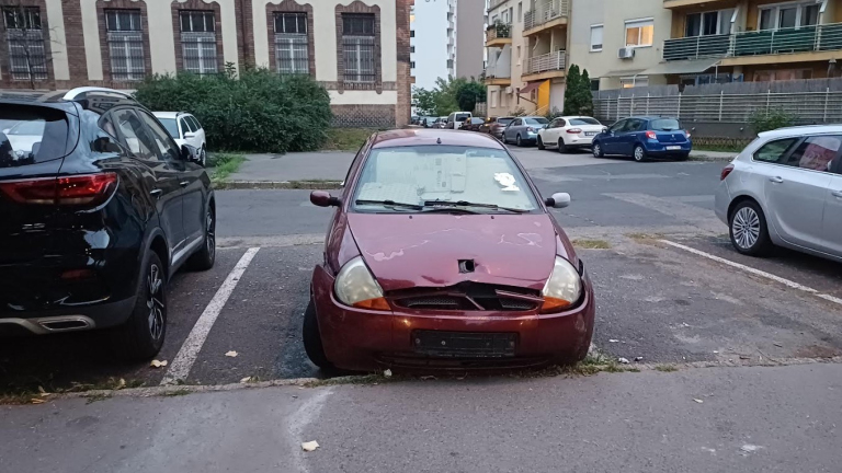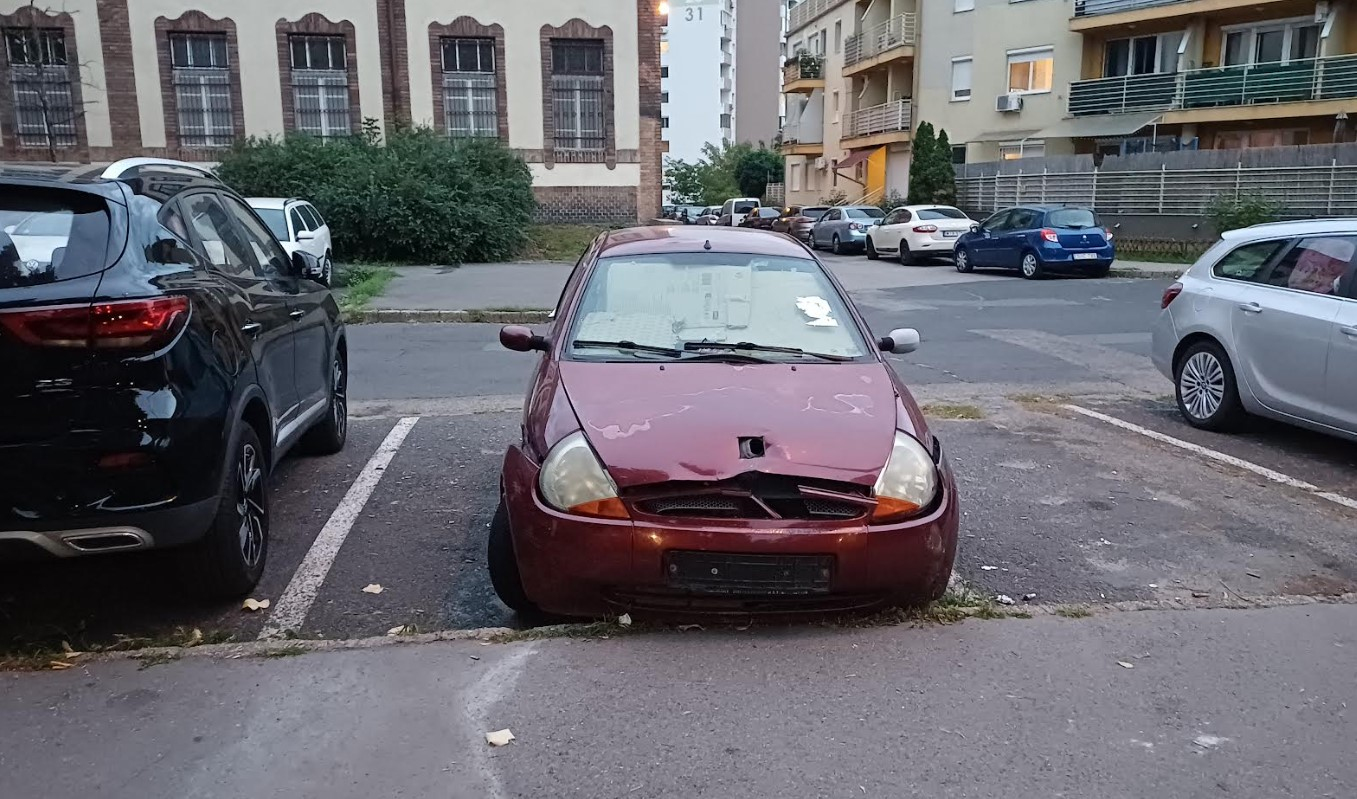 Nincs rajta rendszám, törött oldalüvegek, két parkolóhelyet foglal. Láthatóan korábban kapott hatósági felszólítást, de semmi nem történt vele. Kérem az önkormányzatot, hogy intézkedjenek a jármű elszállításáról!