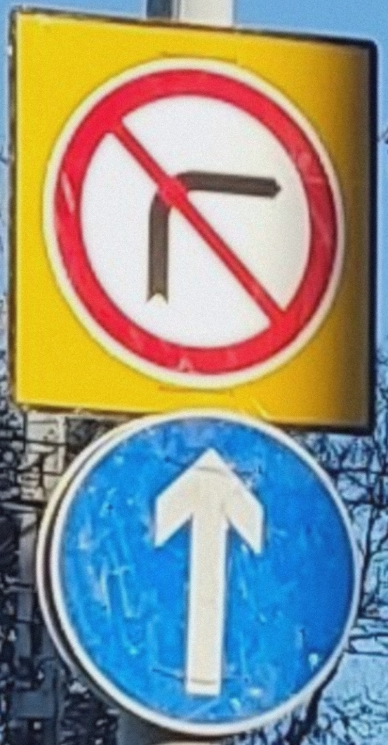 Talán a legeredményesebb megoldás lehetne, ha egyrészt új tábla kerülne kihelyezésre, ami a balra kanyarodást tiltja és (!) sárga háttere van, valamint a kötelező haladási ir...