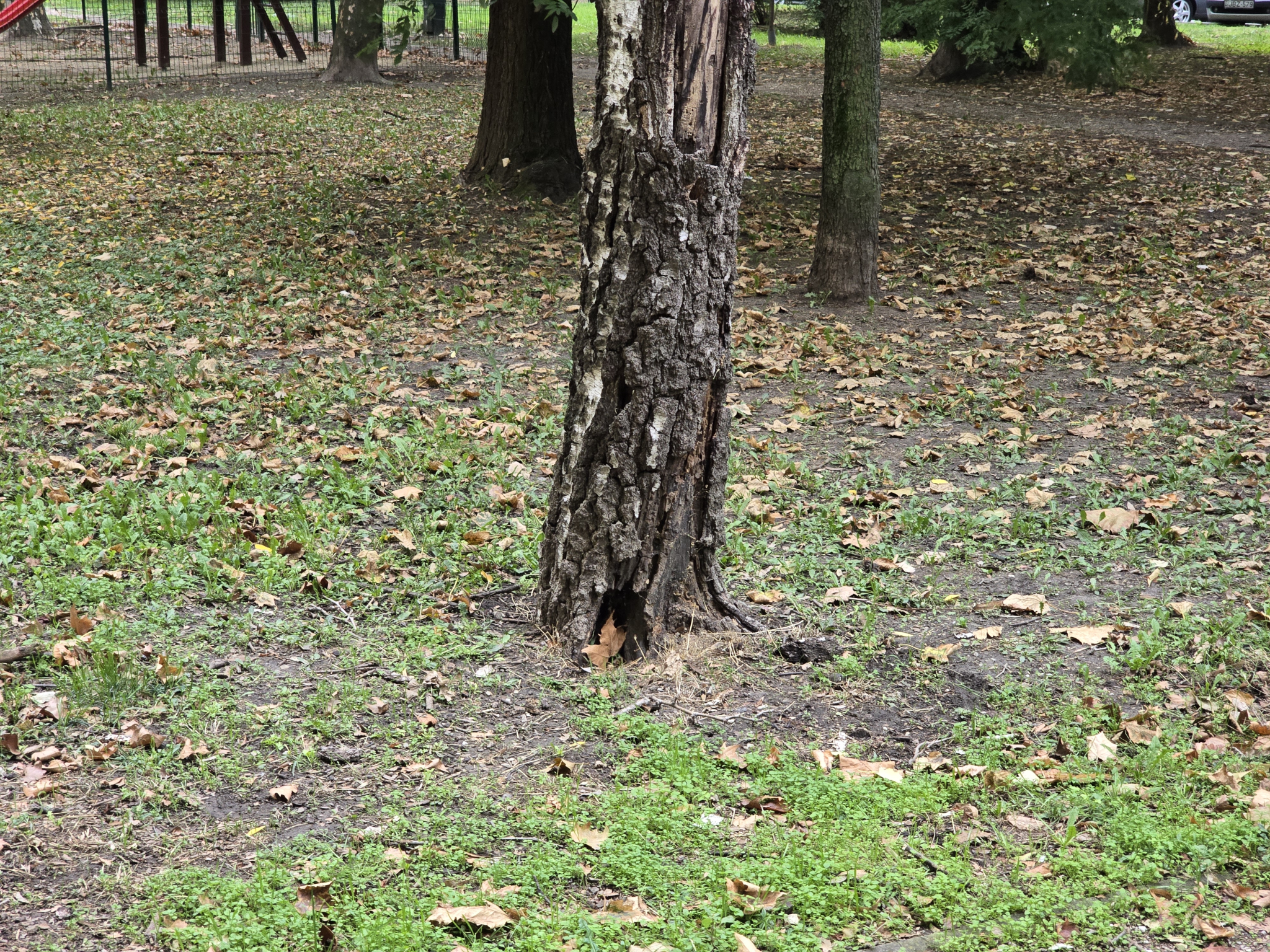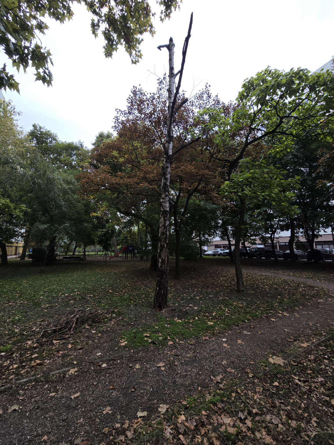 Kiscelli utca - Szőlő köz közötti parkban lassan két éve (van az lassan három is) a parkon keresztül menő ösvény mellett egy kiszáradt, elpusztult fa áll, a törzse lassan belülről korhad el teljesen.
