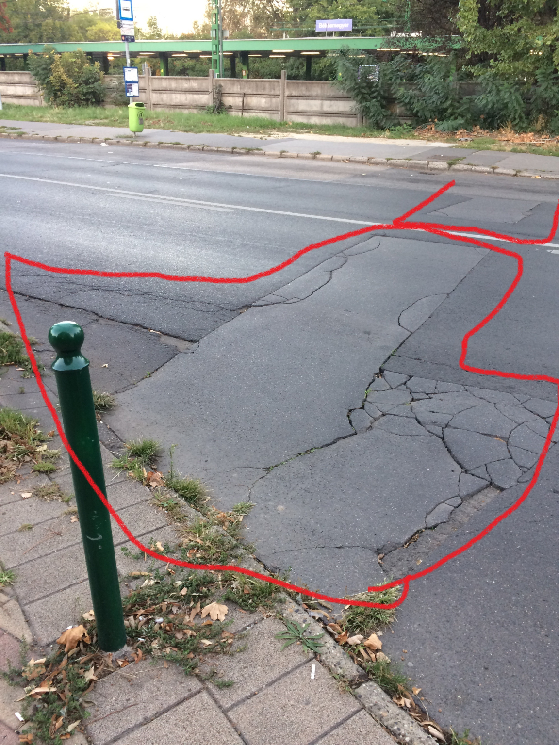 Jelzett helyszínen lévő út borzasztó állapotban van, repedezett, kátyús, süllyedt.