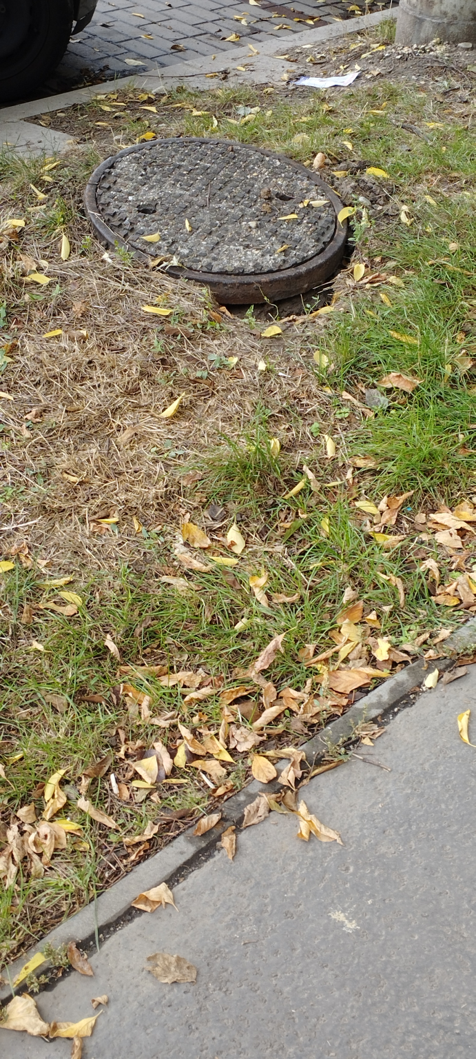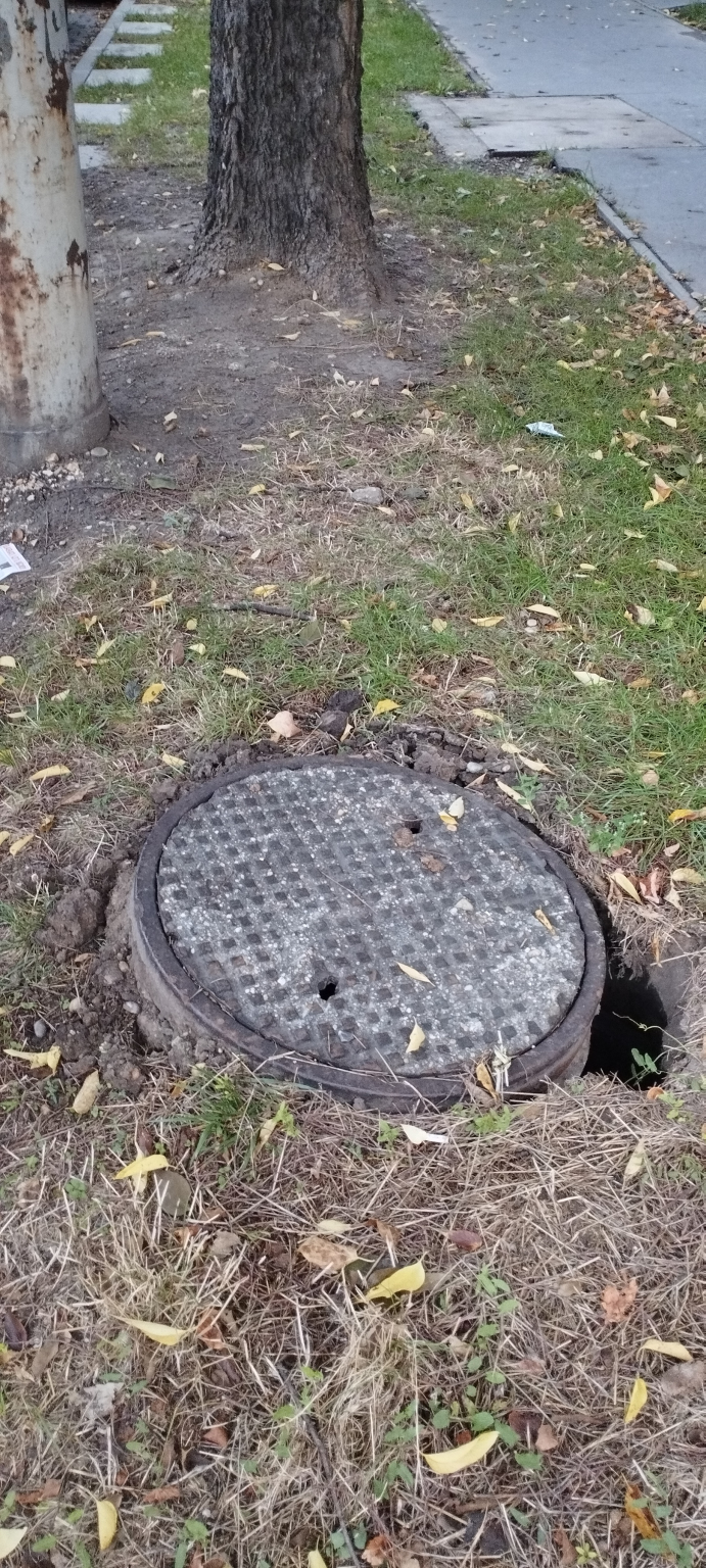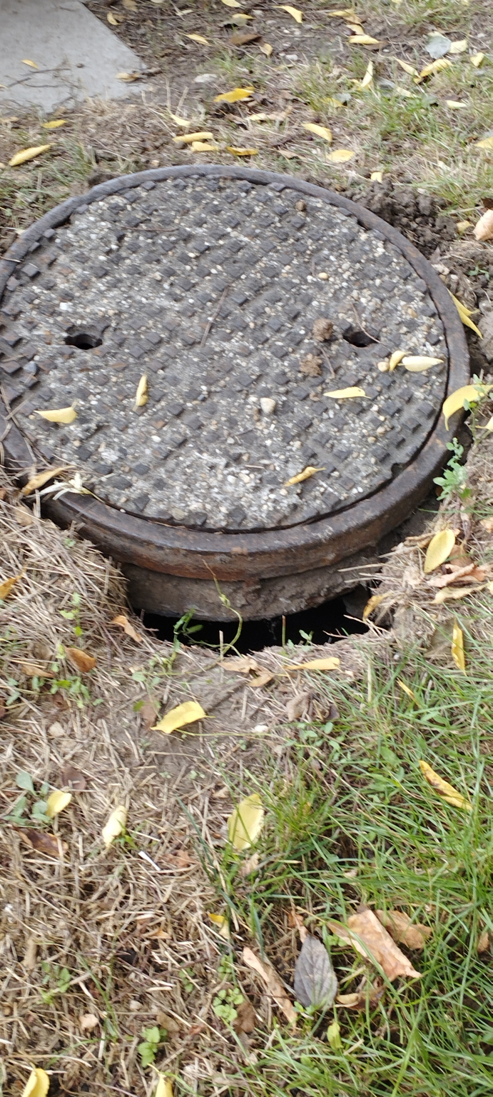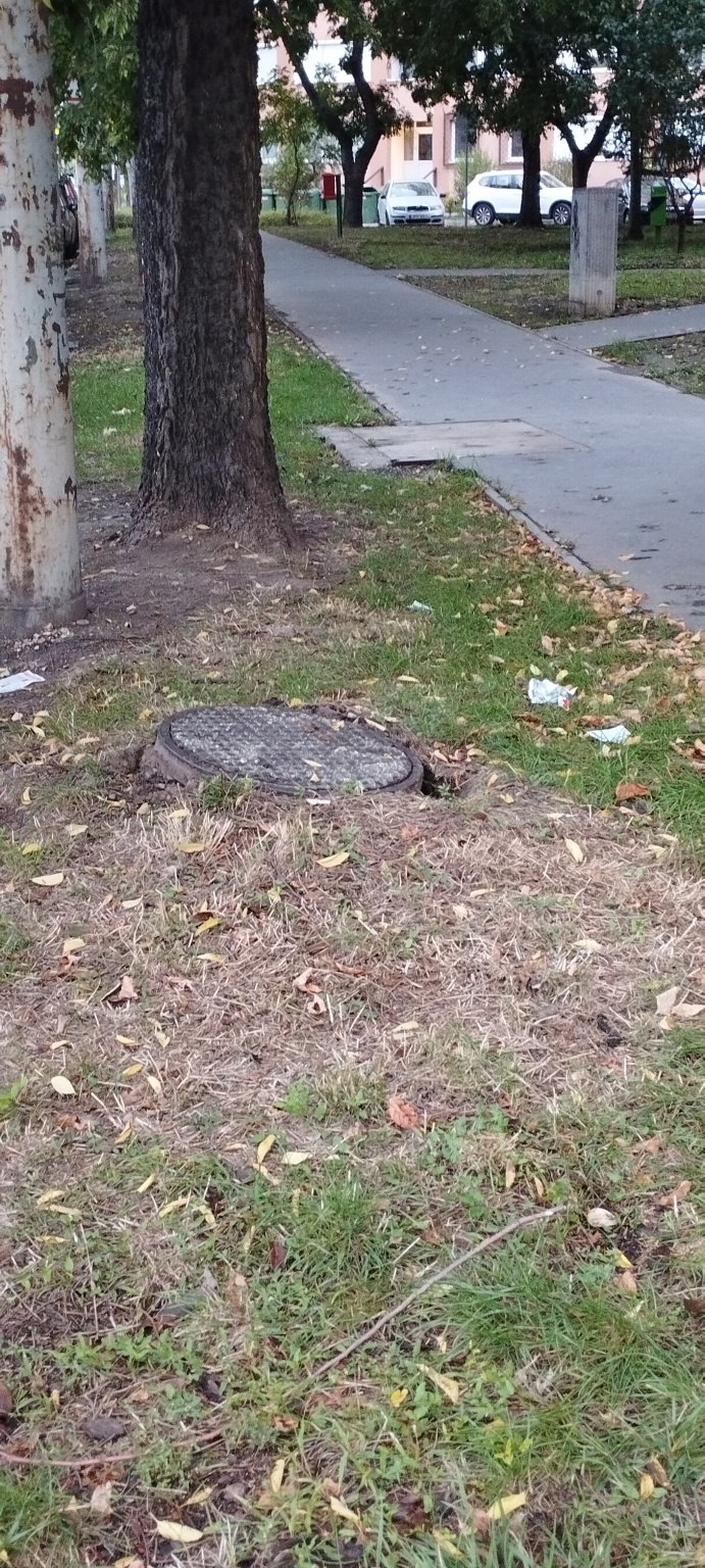 A Vezér utcában a járda melletti füves területen a csatorna fedél kimozdult a helyéről.