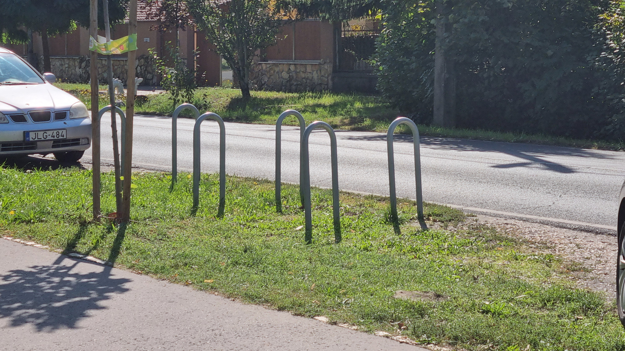 Néhány oszlop van az autóút mellett, azonban a kerékpárokat általában a játszótér kerítése mellé teszik az ideérkezők.