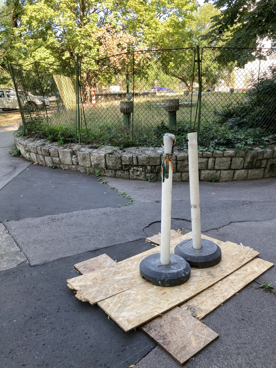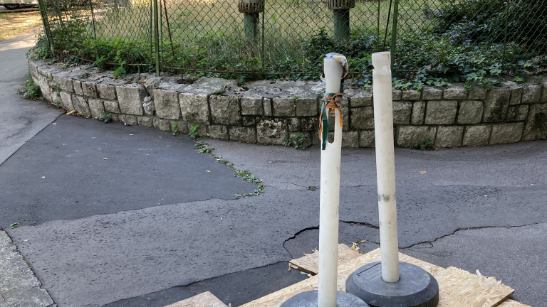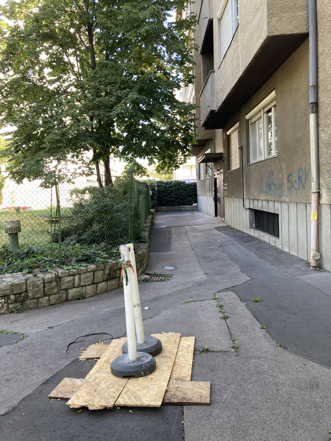 Már egyre jobban repedezik a járda, ahol egy csatornafedél is volt. Ahogy a képen látható, most így van elbarikádozva, de már hetek óta.