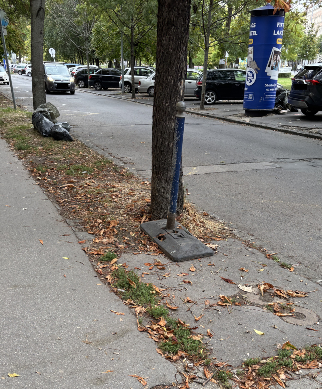 A Hugonnai Vilma térnél van egy db poller az út szélén hagyva