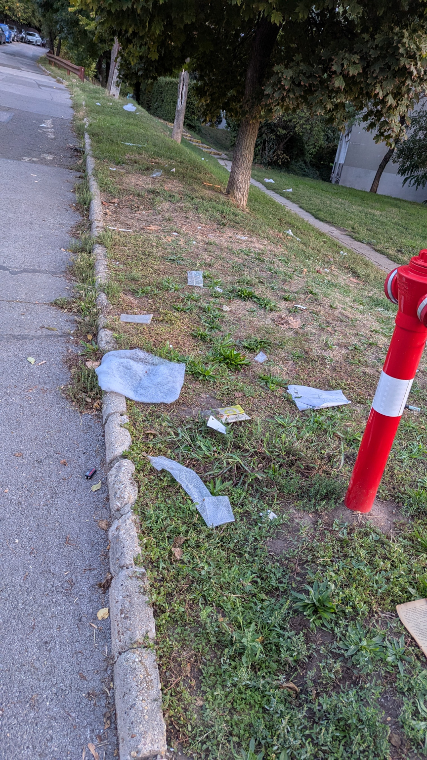 A Toboz utca elején a lomtalanítás után ott maradt a szemét. Törött üveg is van.