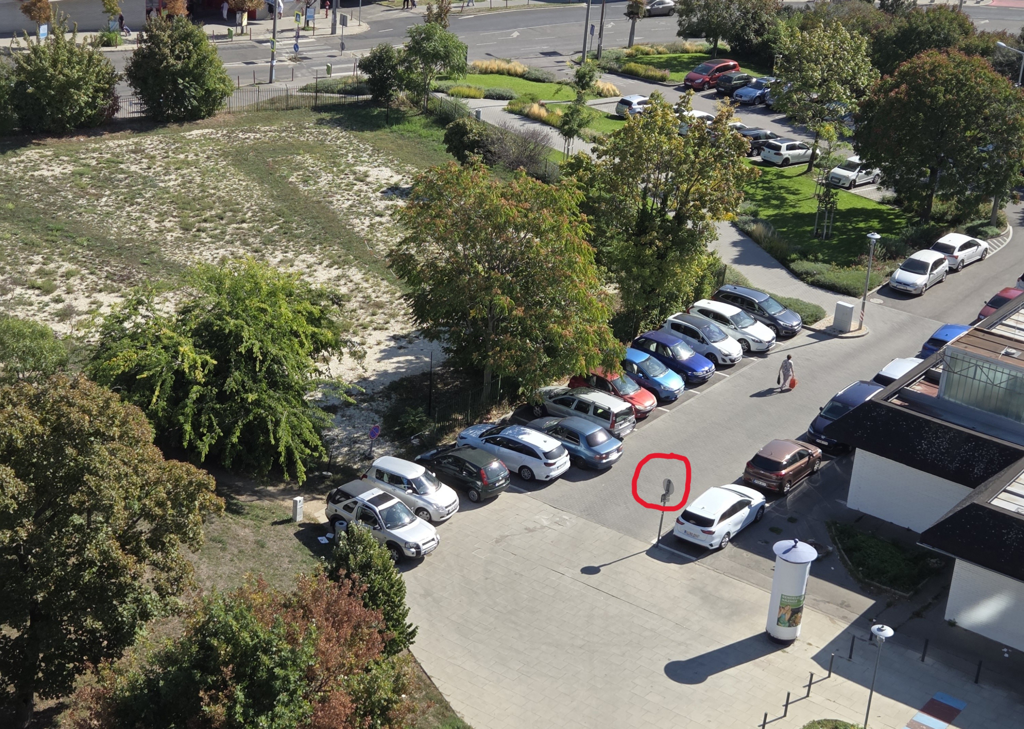 A XI. Nagyszeben téren a - képen bekarikázott helyen - mindkét irányból behajtani tilos tábla ellenére is rendszeresen behajtanak gépjárművel és parkolnak is a téren. Alatt két kiegészítő tábla van: kivéve szemétszállítás, illetve a Nagyszeben tér 2. lakói, akik a ház mögé behajthatnak parkolás céljából. Sokszor úgy parkolnak szabálytalanul a téren, hogy akadályozzák a ház mögé való behajtását vagy onnan kihajtását a lakóknak. A kiegészítő táblák sérültek is, elhajlottak. Célszerű lenne a megállni tilos tábla, illetve egy lakó pihenő övezet tábla kihelyezése is, mivel az összes többi utcánál kint van a lakótelepen.