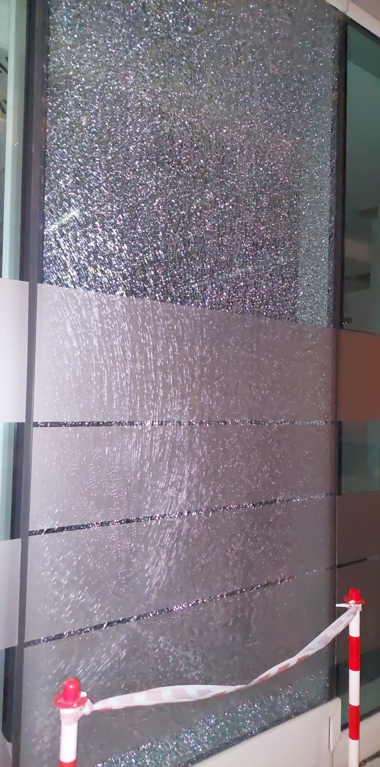 Irodaház üvegablaka szilánkosan be van törve