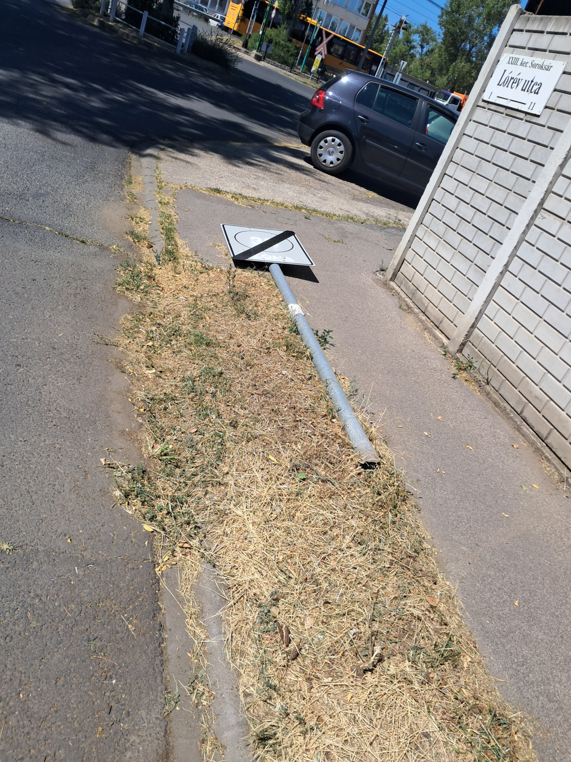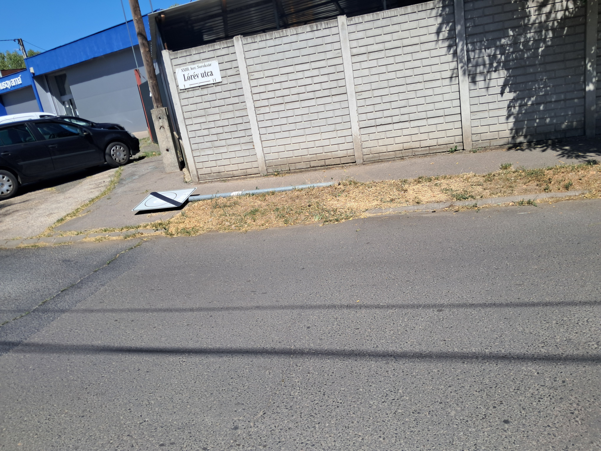 A táblát lassan 3 hónapja valaki kidöntötte, kérem javítsák meg vagy legalább szállítsák el, mert baleset veszélyes, nem látszik és valaki ráhajt.