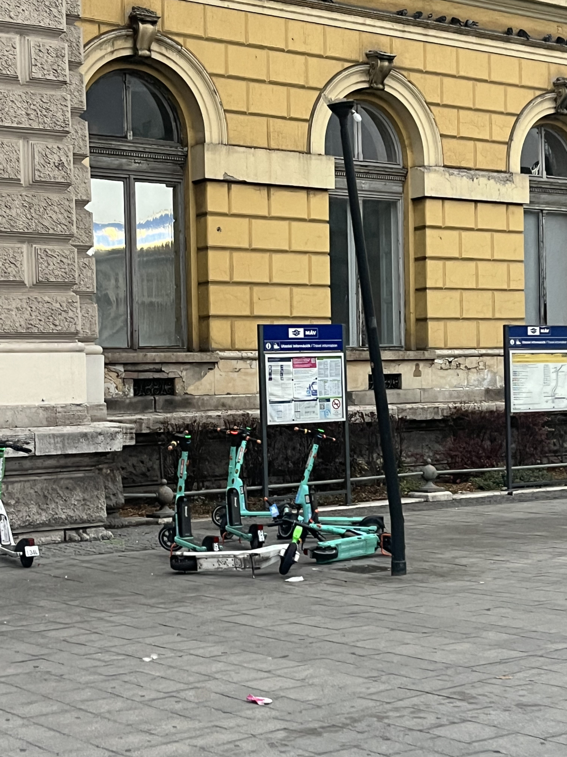 A Keleti pu. előtt két oszlop is sérült -feltehetőleg rongálás miatt. Nincs búrájuk és lóg az izzó csatlakozási pontja.