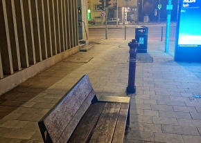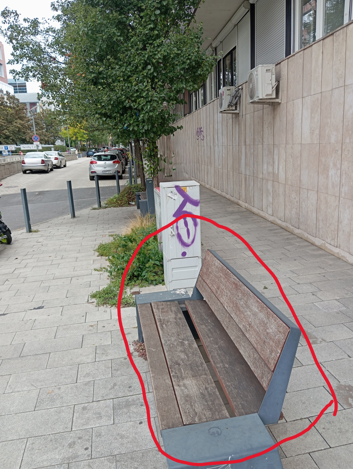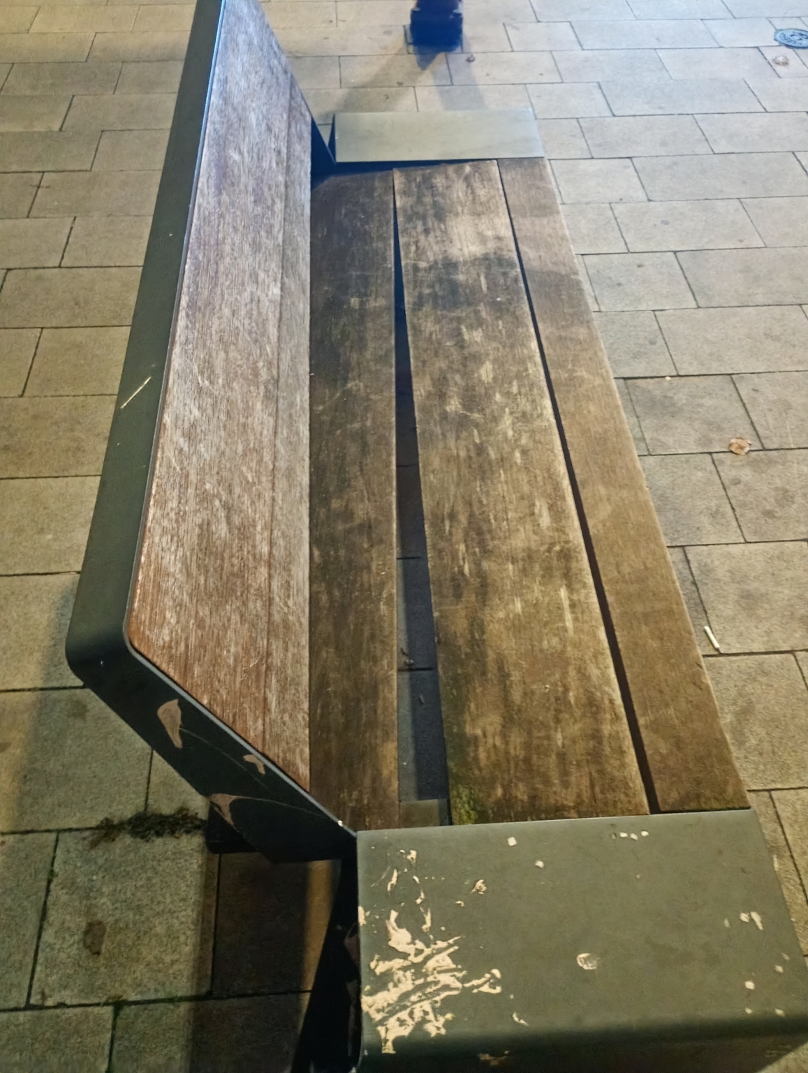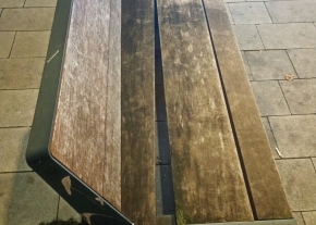 Kérem az illetékest, hogy a képen látható pad ülőkéjének deszkáit rögzítse az eredeti helyükön, mert esik szét!