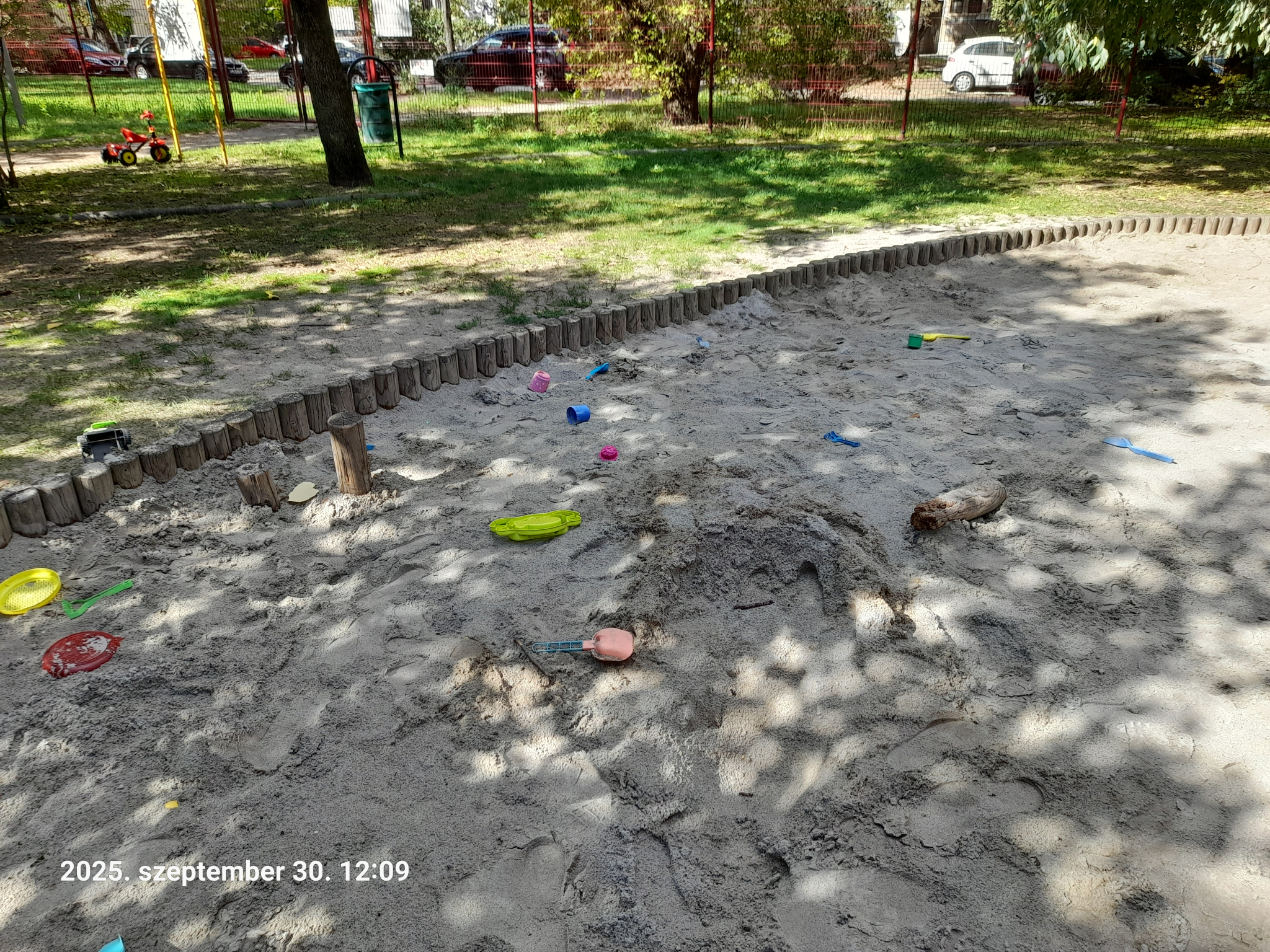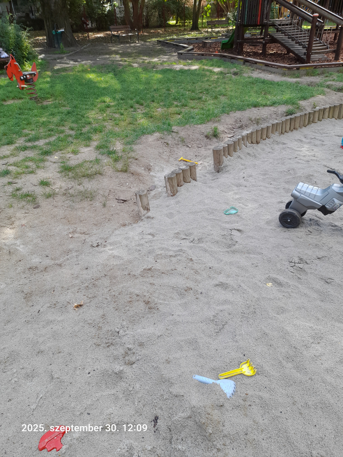 A Macis játszótéren a homokozó széléül szolgáló fatuskókat a gyerekek megbontották. Most nagy területen hiányzik a homokozó széle, ezek a fatuskók pedig szanaszét hevernek, balesetveszélyesek.