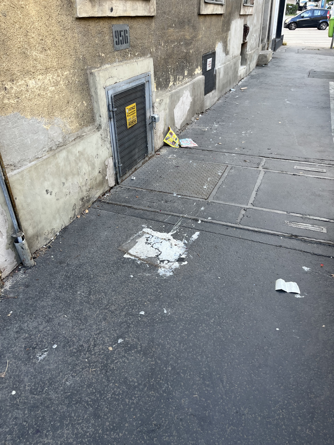 Belső Óbudán, a Kiscelli utca 94. házszám előtt kiomlott festék van az utcán, amibe az óvatlan járókelők belelépnek és széthordanak, így jártam én is.