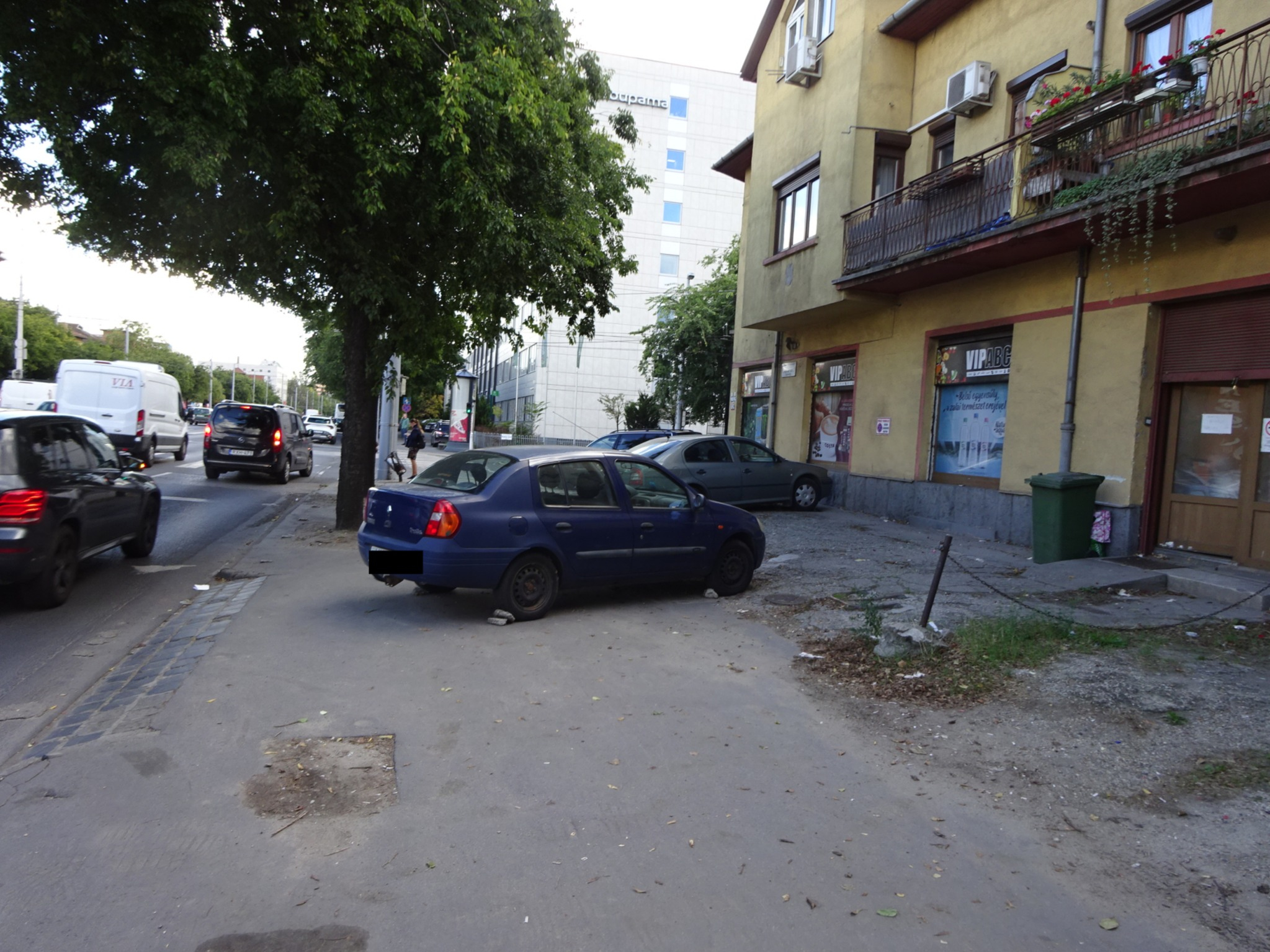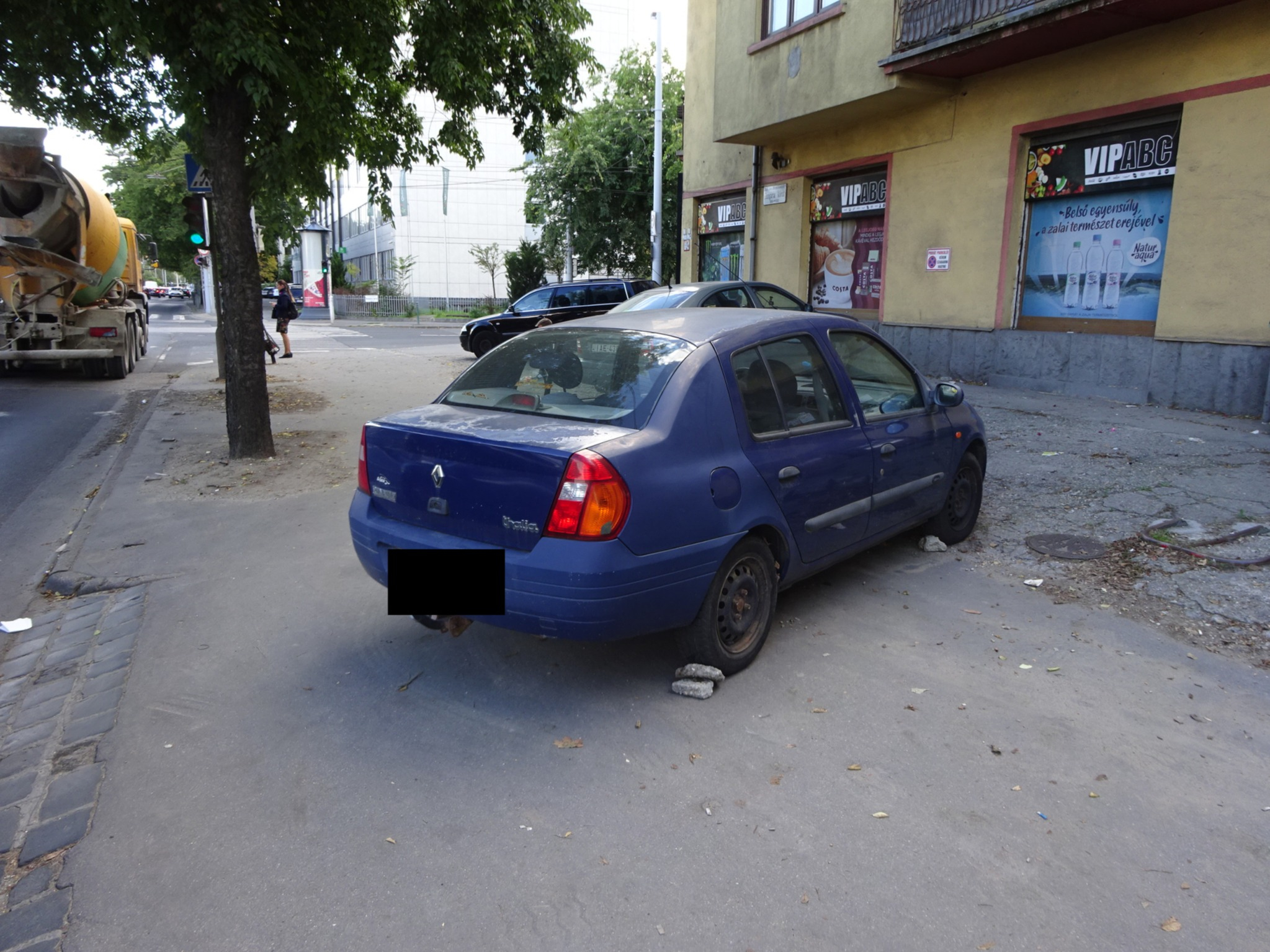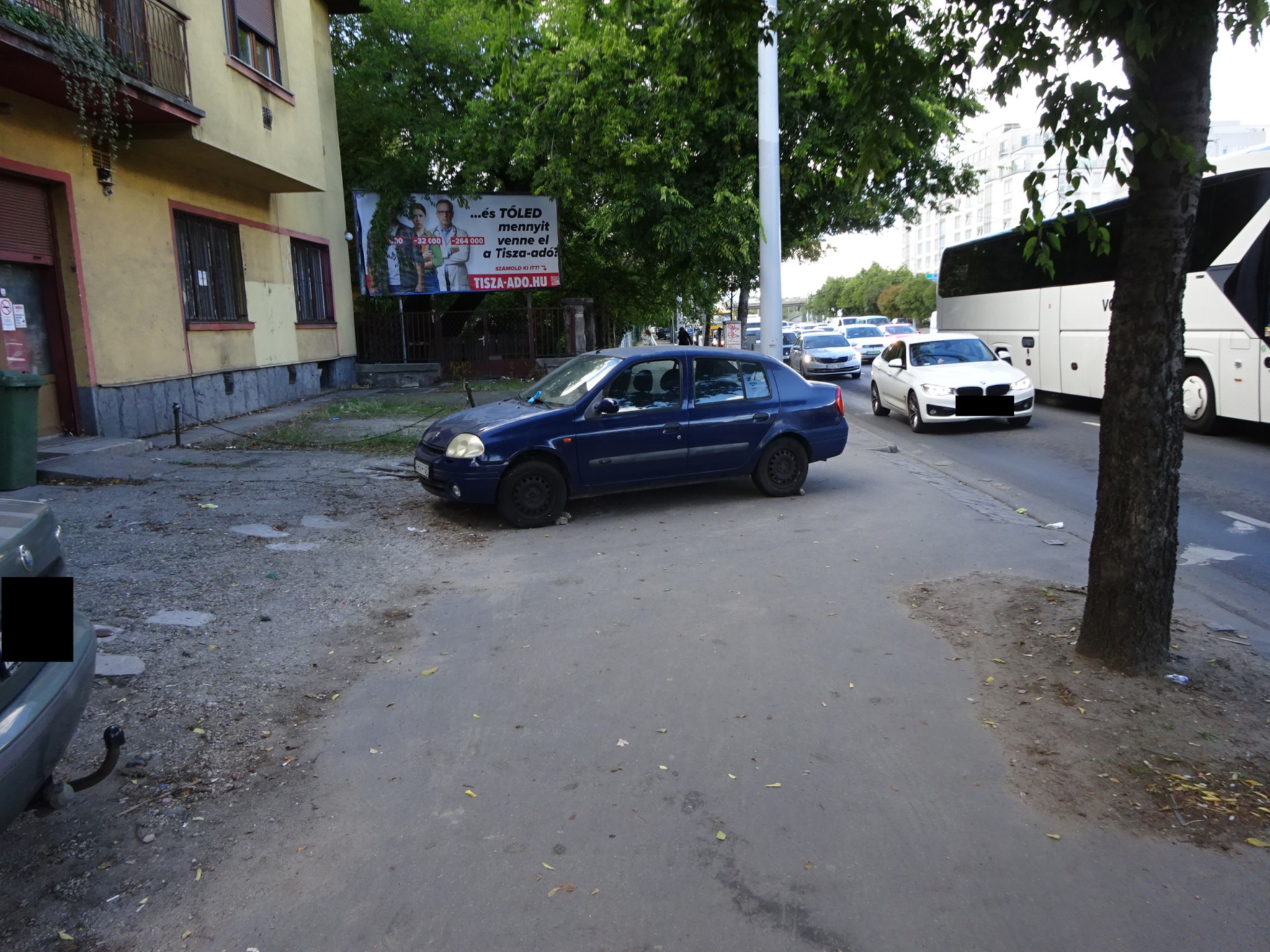 A 1146 Bp. Hungária körút 188. előtt a járdán egy elhagyott autó áll. Engem személyesen annyiban érint, hogy megnehezíti a ház fala melletti magán parkolóm megközelítését.