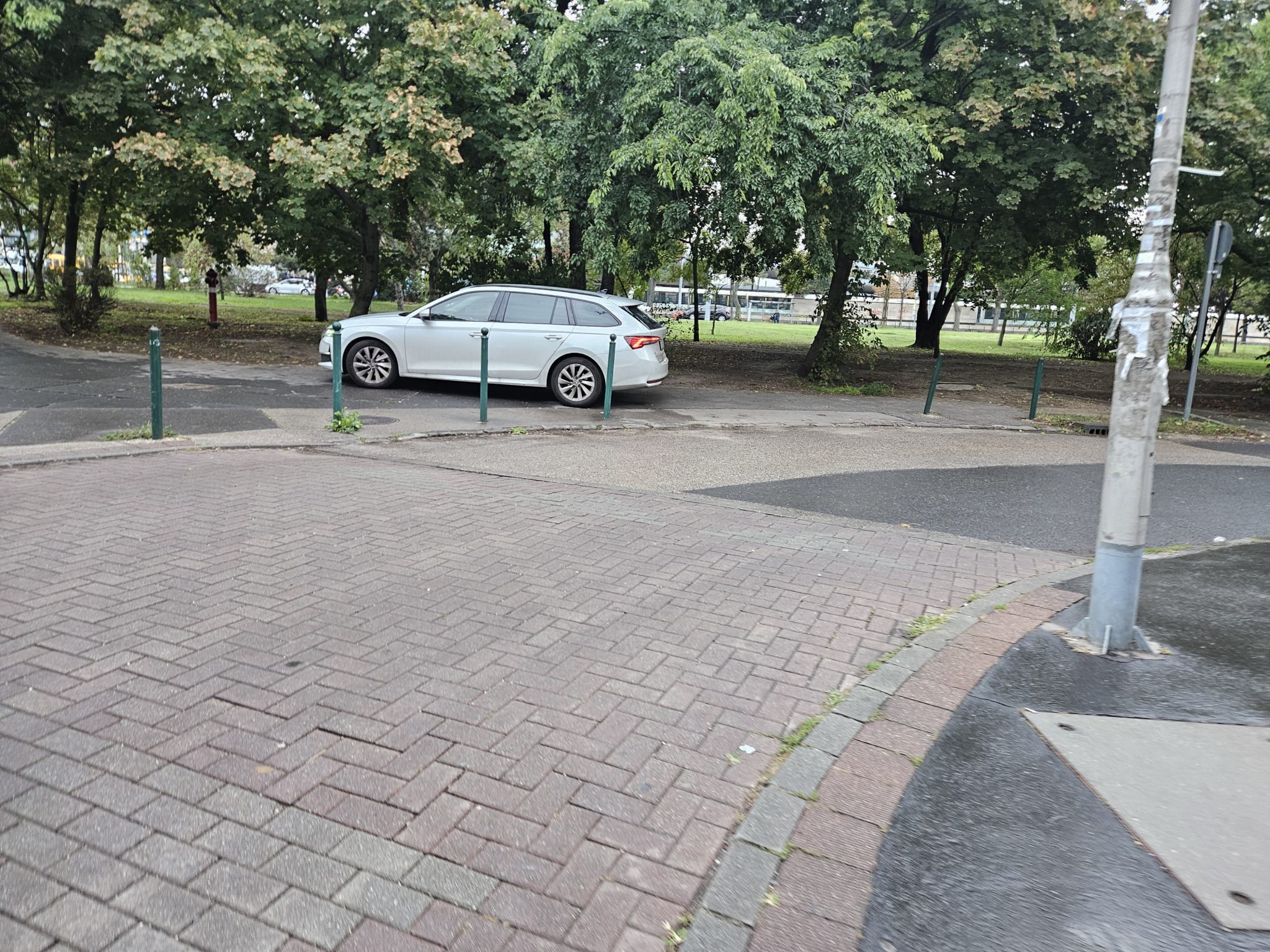 Az Örs vezér tere 1. előtt hiányzó poller miatt szabálytalan parkolás.