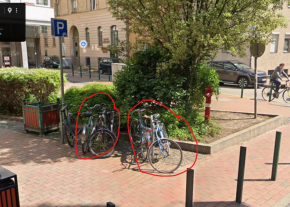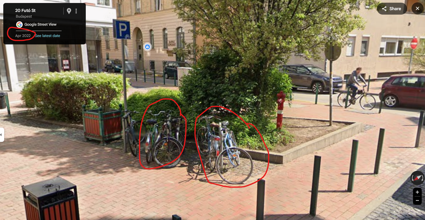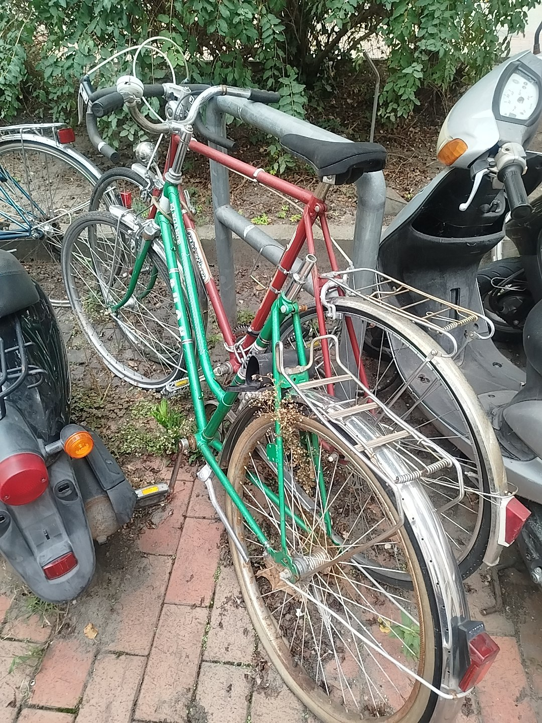 A két kék, a zöld és a piros kerékpárok nagyon régóta ugyanitt.