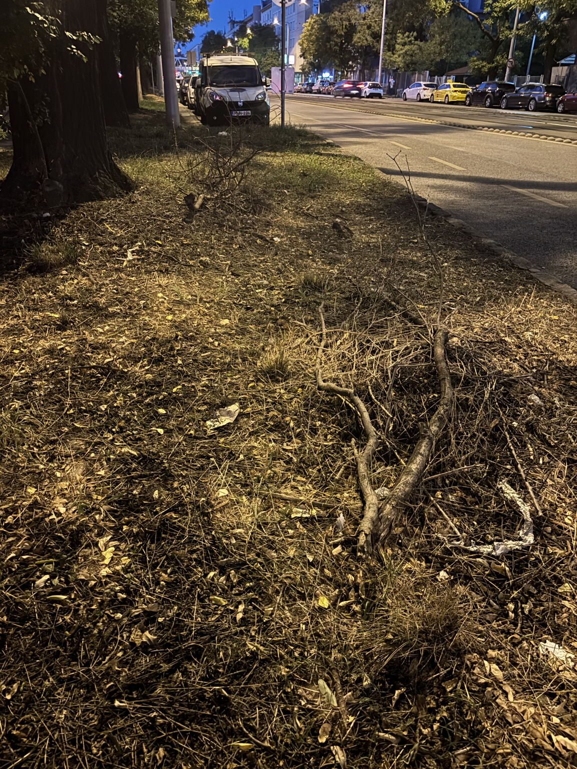 A Fehérvári út 59-től egészen a Tesco-ig rendezetlen bokrok illetve szétdobált faágak vannak.
