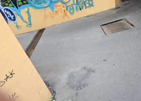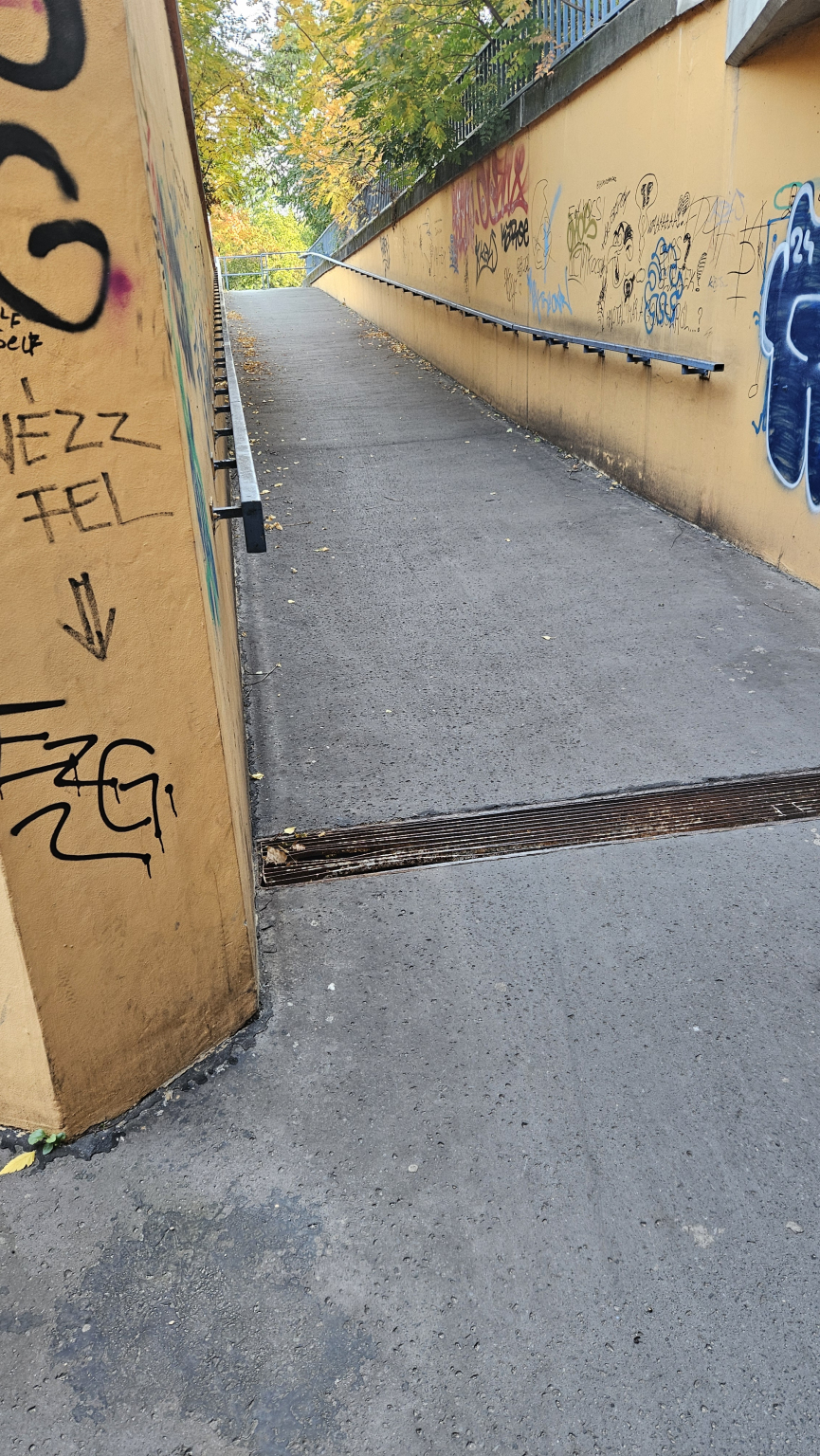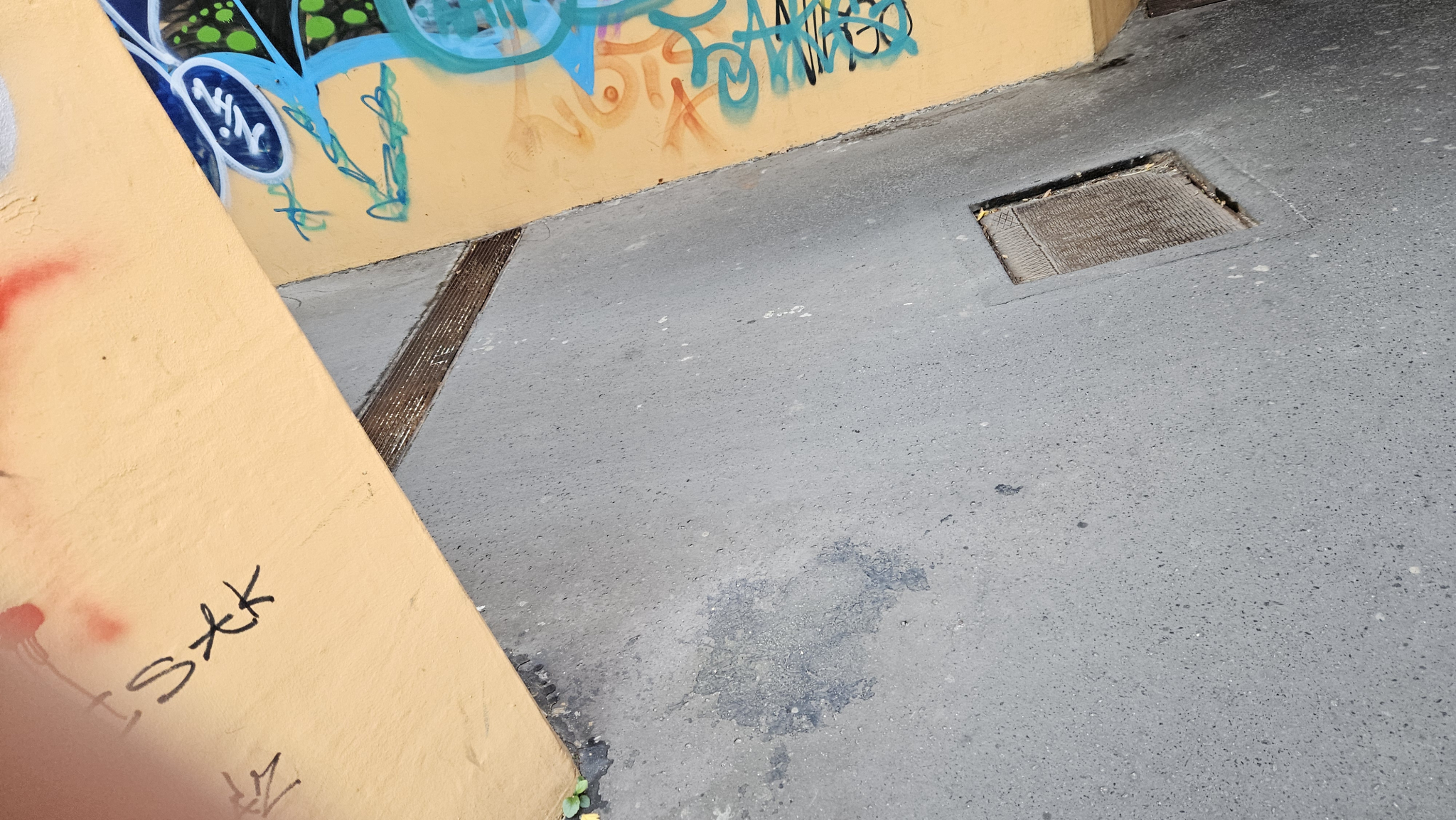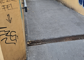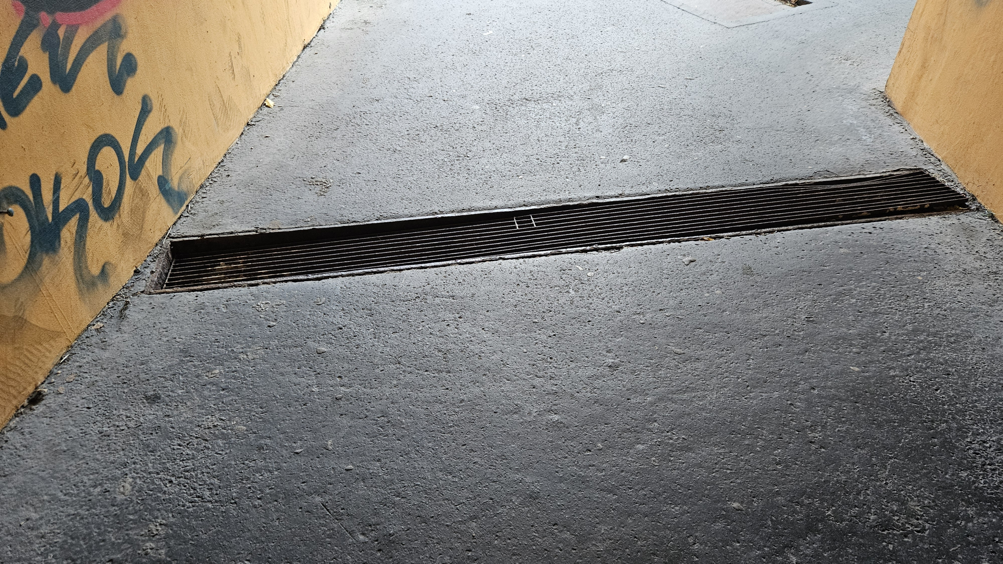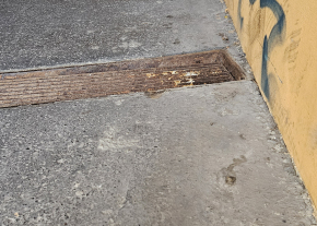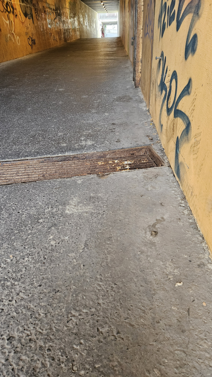 Barosstelep vasúti megállónál a gyalogos aluljáró északi végén a vízelvezető rácsok megsüllyedtek, botlásveszélyesek.