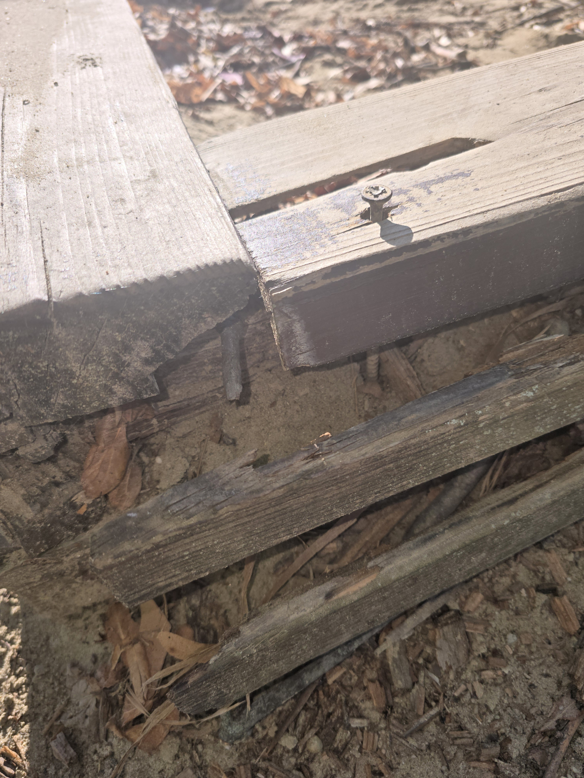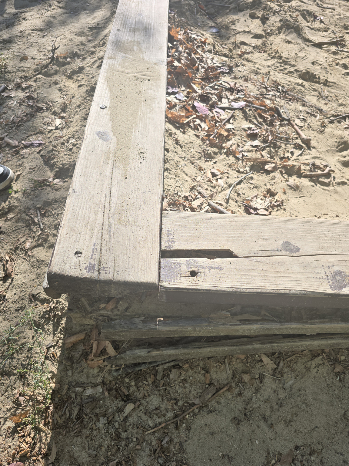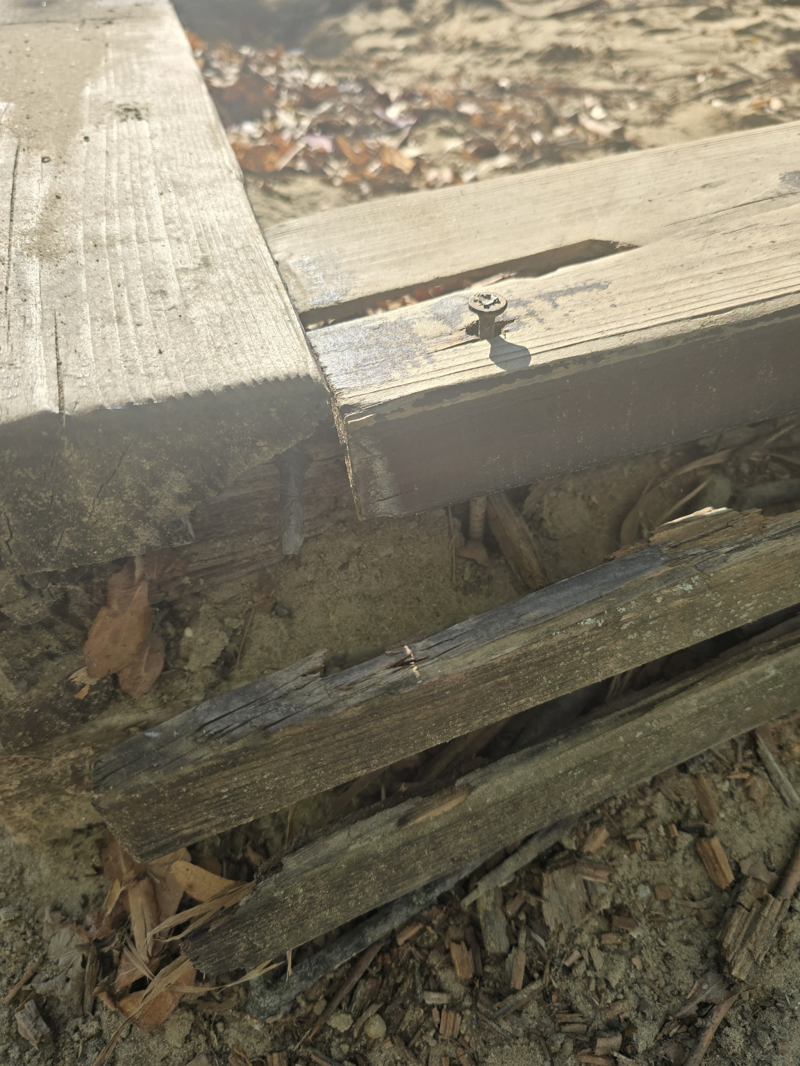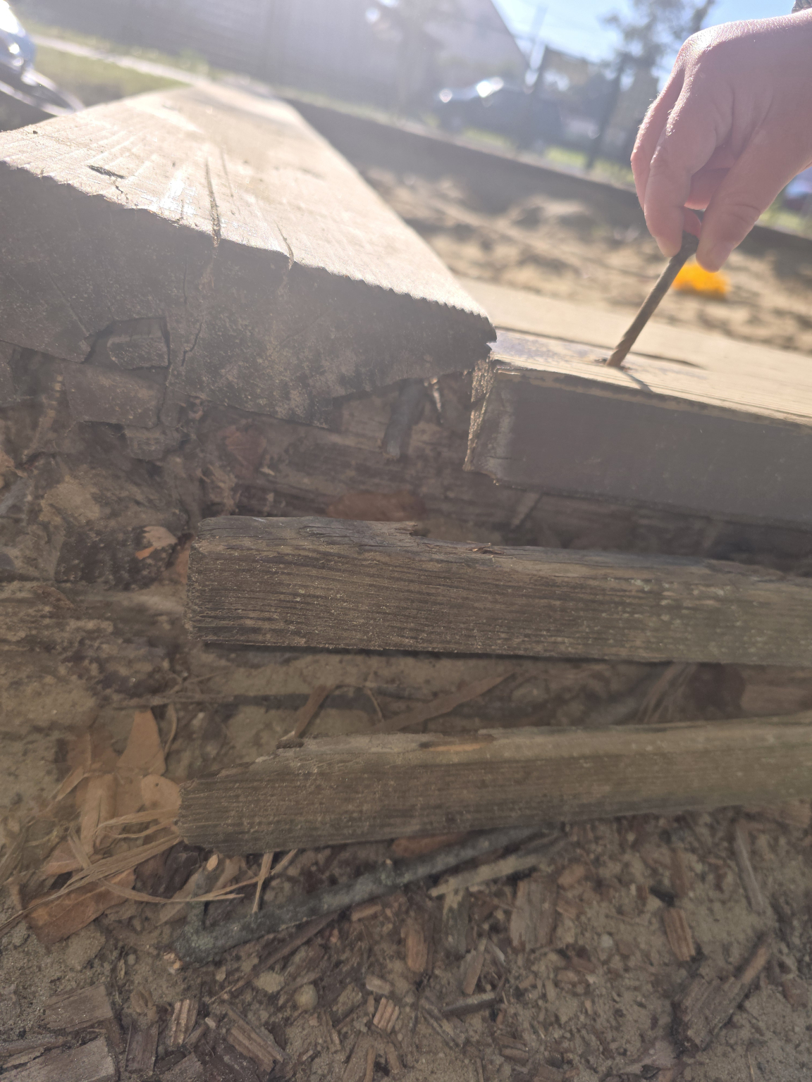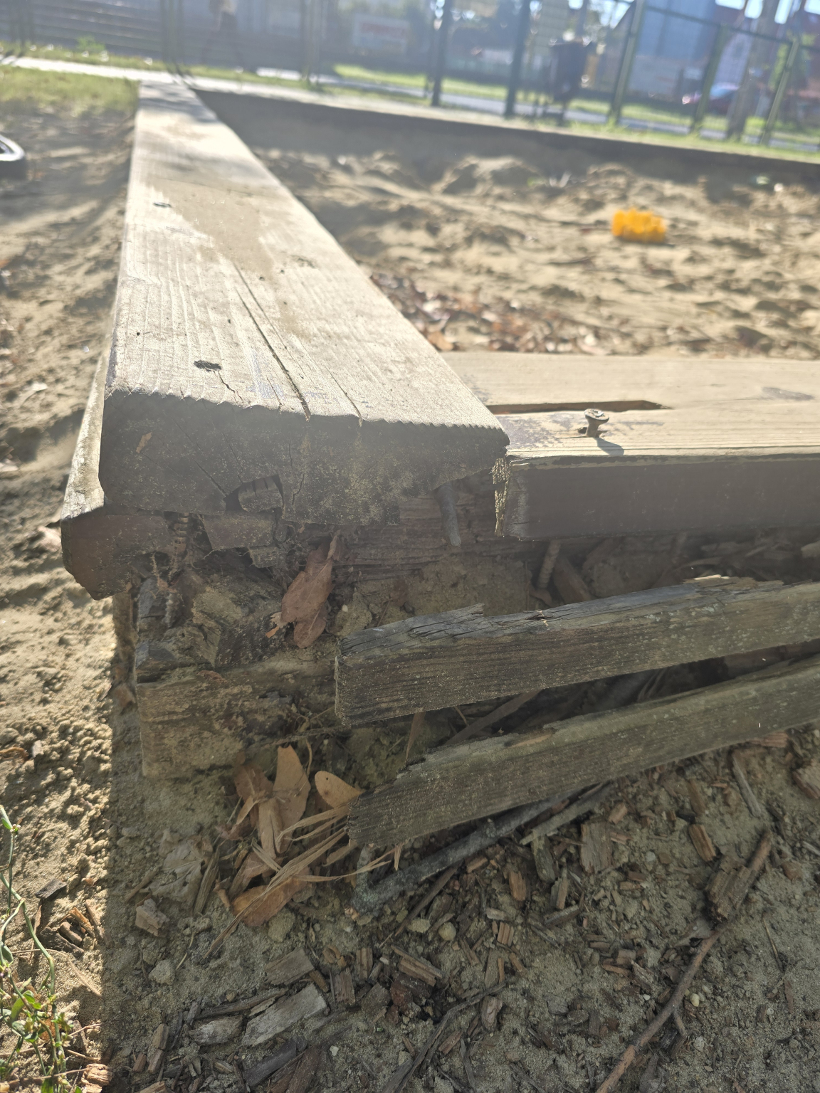Veszélyes, elkorhadt fa, kiálló szögek. A homok évek óta nem volt cserélve. Szeretnénk egy biztonságosan használható játékot a kicsik részére is.