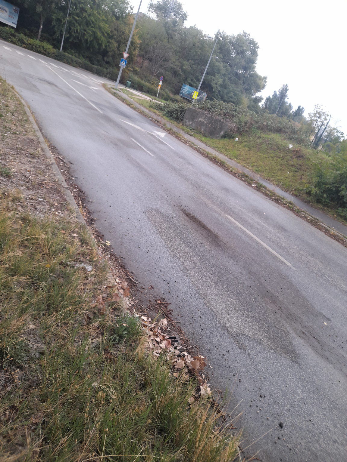 Jó reggelt, egy járműből olaj ömlött az úttestre, a vezetője észlelhette, felreállt, de így a járda is olajos lett, és az úttest is, sok méteren át, ráadásul kereszteződésben és jobbra kanyarodó sáv kivezető ívében, ami rendkívül veszélyes, főleg hogy esett is az eső. Talán valaki rádobott egy lapát földet onnan az út széléről, de ez így SOS veszélyes!
