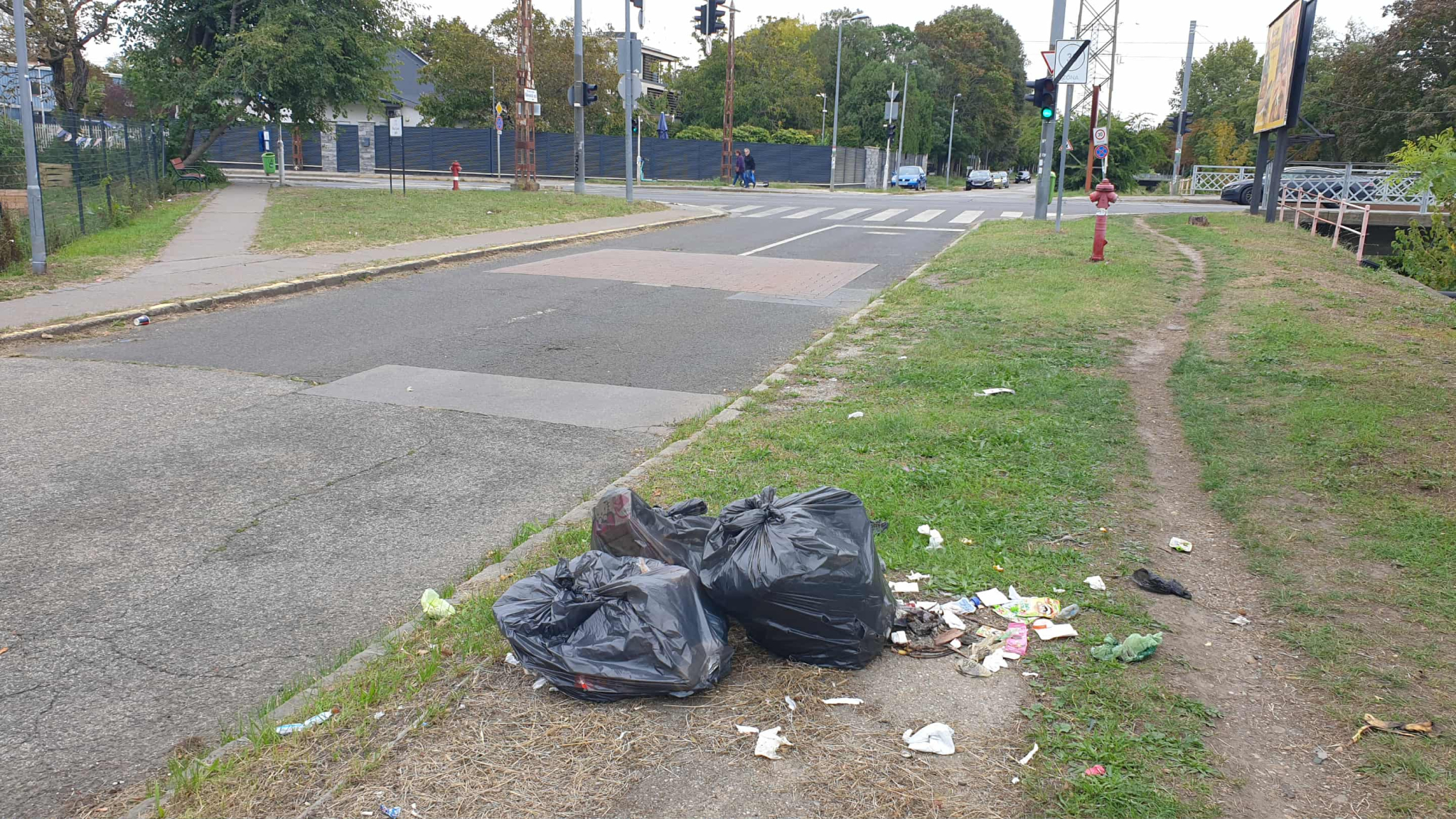 Kihajított szemeteszsák a patakparton, a Pécsi Eszter parkban.