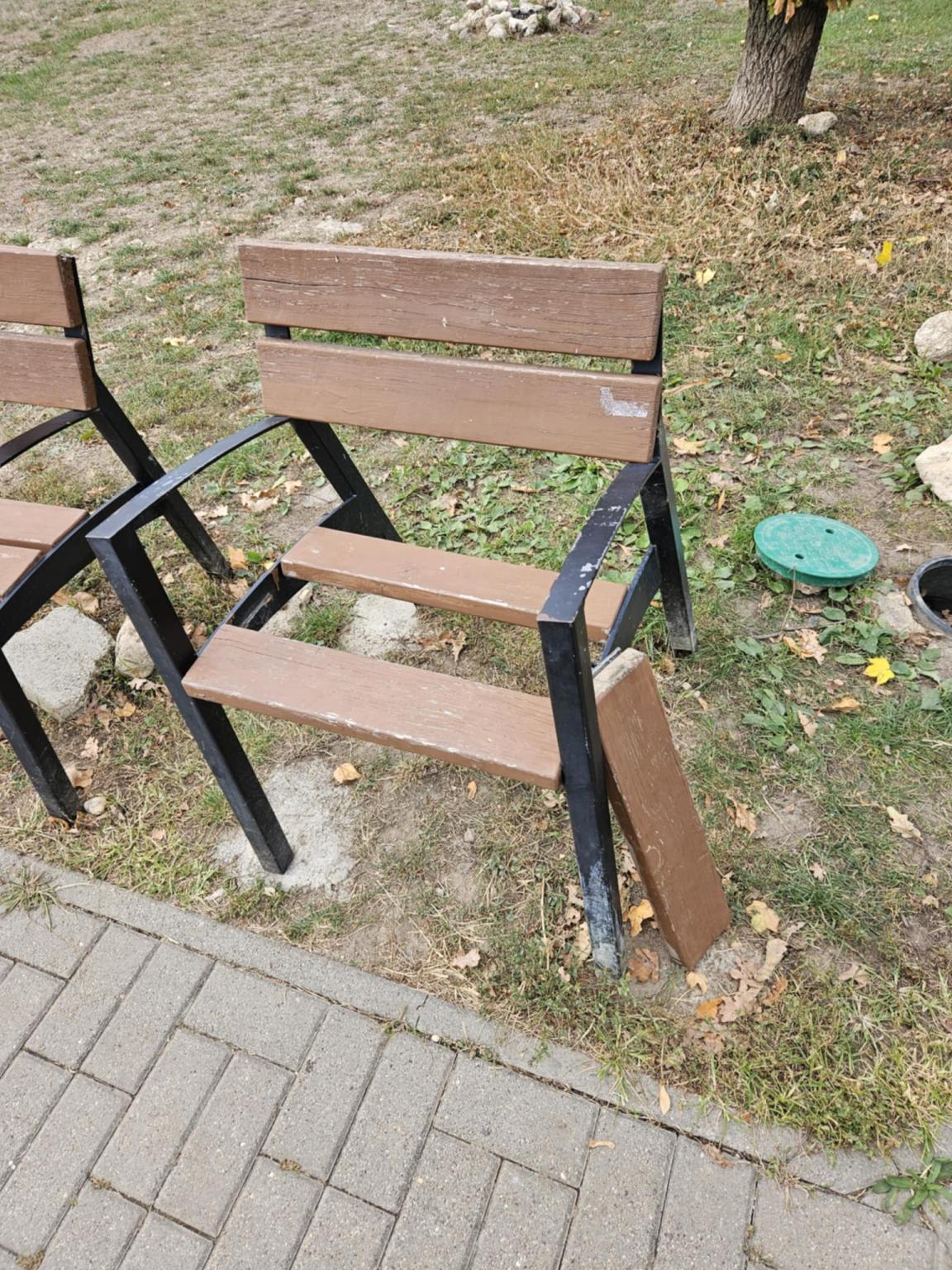 Törött utcai bútor: a Komondor-Brassó park tetejénél lévő szék ülőrésze eltört.