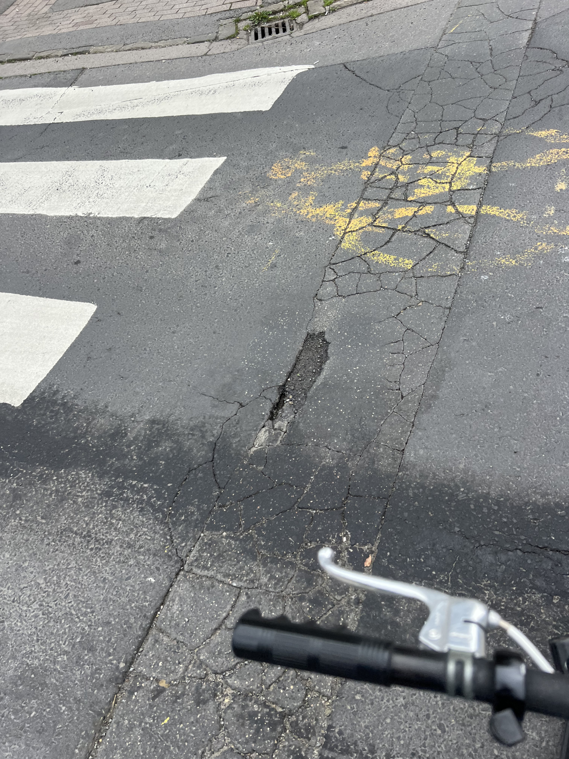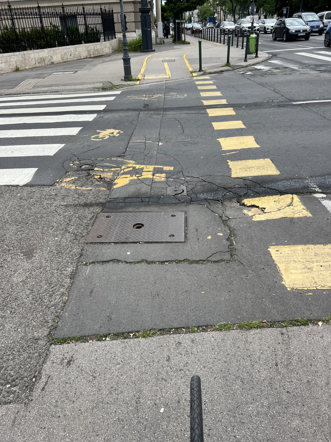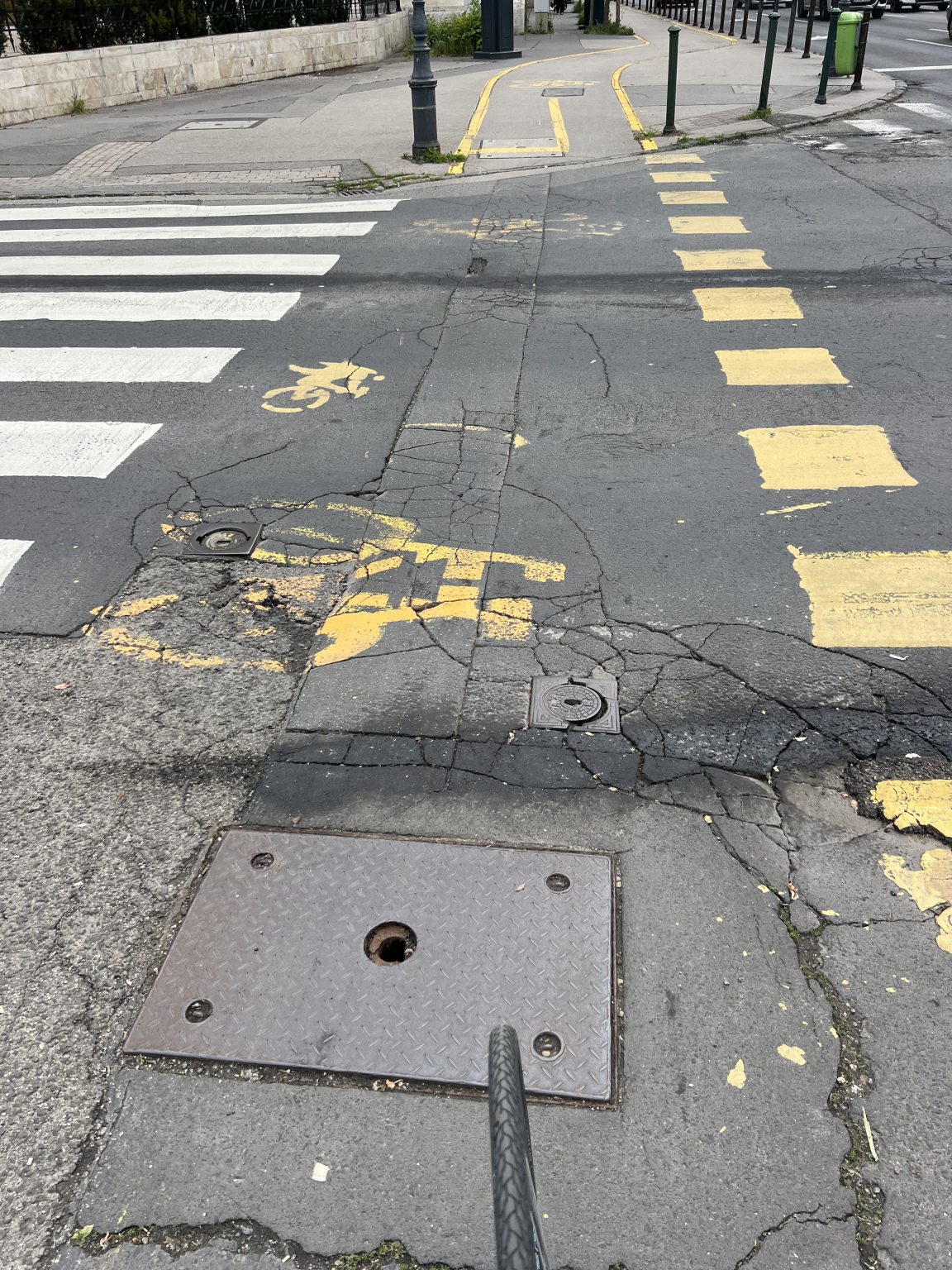A Gundel Károly út- Dózsa György út sarkán a bicikli út átkelője kátyús, repedezett, veszélyes állapotban van már hónapok, ha nem évek óta.